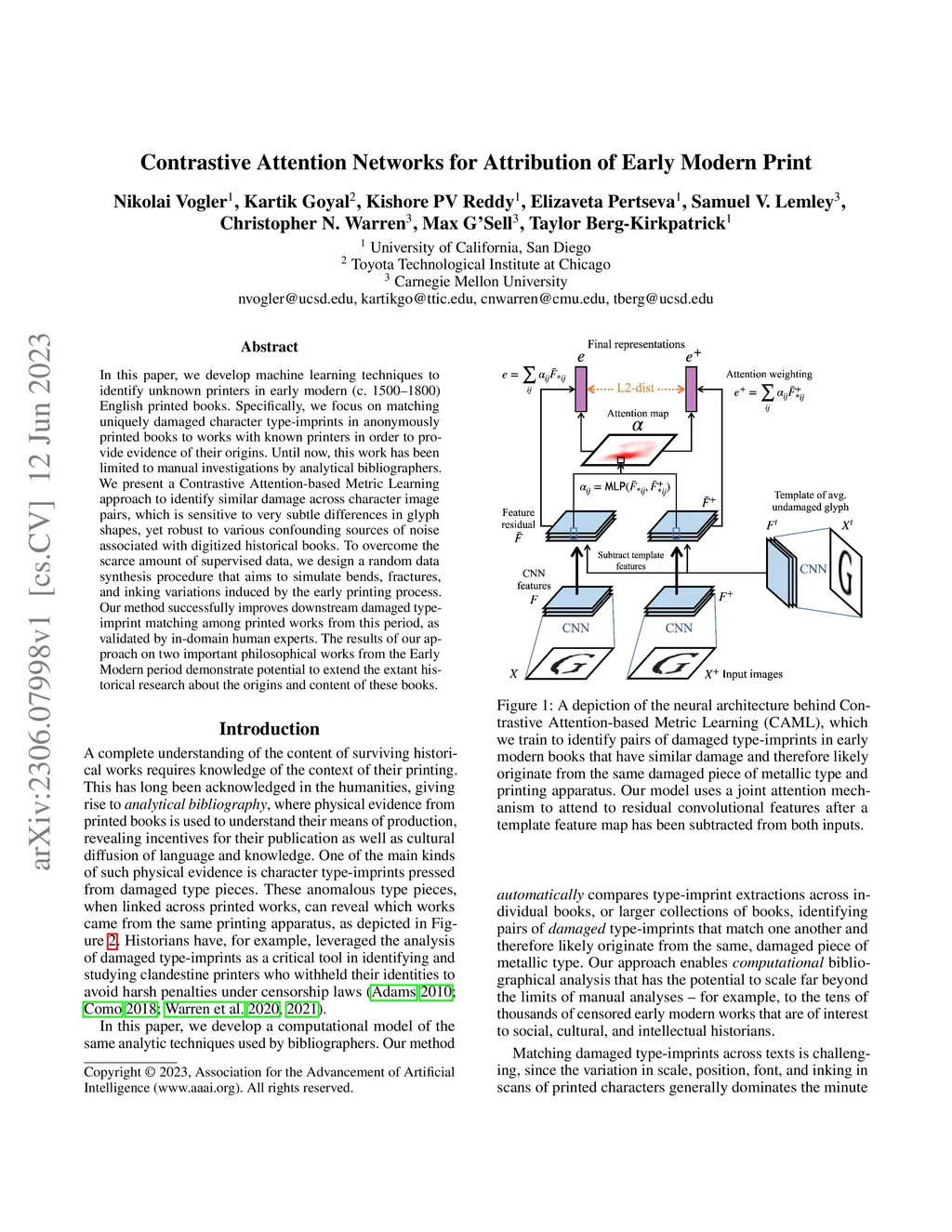 In this paper, we develop machine learning techniques to identify unknown printers in early modern (c.~1500--1800) English printed books. Specifically, we focus on matching uniquely damaged character type-imprints in anonymously printed books to works with known printers in order to provide evidence of their origins. Until now, this work has been limited to manual investigations by analytical bibliographers. We present a Contrastive Attention-based Metric Learning approach to identify similar damage across character image pairs, which is sensitive to very subtle differences in glyph shapes, yet robust to various confounding sources of noise associated with digitized historical books. To overcome the scarce amount of supervised data, we design a random data synthesis procedure that aims to simulate bends, fractures, and inking variations induced by the early printing process. Our method successfully improves downstream damaged type-imprint matching among printed works from this period, as validated by in-domain human experts. The results of our approach on two important philosophical works from the Early Modern period demonstrate potential to extend the extant historical research about the origins and content of these books.