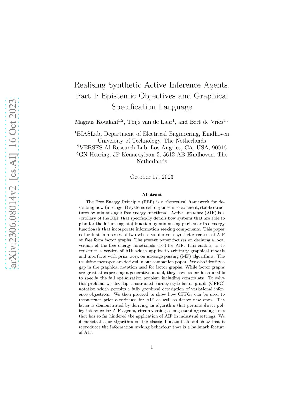 The Free Energy Principle (FEP) is a theoretical framework for describing how (intelligent) systems self-organise into coherent, stable structures by minimising a free energy functional. Active Inference (AIF) is a corollary of the FEP that specifically details how systems that are able to plan for the future (agents) function by minimising particular free energy functionals that incorporate information seeking components. This paper is the first in a series of two where we derive a synthetic version of AIF on free form factor graphs. The present paper focuses on deriving a local version of the free energy functionals used for AIF. This enables us to construct a version of AIF which applies to arbitrary graphical models and interfaces with prior work on message passing algorithms. The resulting messages are derived in our companion paper. We also identify a gap in the graphical notation used for factor graphs. While factor graphs are great at expressing a generative model, they have so far been unable to specify the full optimisation problem including constraints. To solve this problem we develop Constrained Forney-style Factor Graph (CFFG) notation which permits a fully graphical description of variational inference objectives. We then proceed to show how CFFG's can be used to reconstruct prior algorithms for AIF as well as derive new ones. The latter is demonstrated by deriving an algorithm that permits direct policy inference for AIF agents, circumventing a long standing scaling issue that has so far hindered the application of AIF in industrial settings. We demonstrate our algorithm on the classic T-maze task and show that it reproduces the information seeking behaviour that is a hallmark feature of AIF.