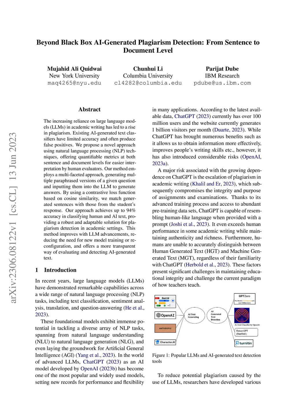 The increasing reliance on large language models (LLMs) in academic writing has led to a rise in plagiarism. Existing AI-generated text classifiers have limited accuracy and often produce false positives. We propose a novel approach using natural language processing (NLP) techniques, offering quantifiable metrics at both sentence and document levels for easier interpretation by human evaluators. Our method employs a multi-faceted approach, generating multiple paraphrased versions of a given question and inputting them into the LLM to generate answers. By using a contrastive loss function based on cosine similarity, we match generated sentences with those from the student's response. Our approach achieves up to 94% accuracy in classifying human and AI text, providing a robust and adaptable solution for plagiarism detection in academic settings. This method improves with LLM advancements, reducing the need for new model training or reconfiguration, and offers a more transparent way of evaluating and detecting AI-generated text.