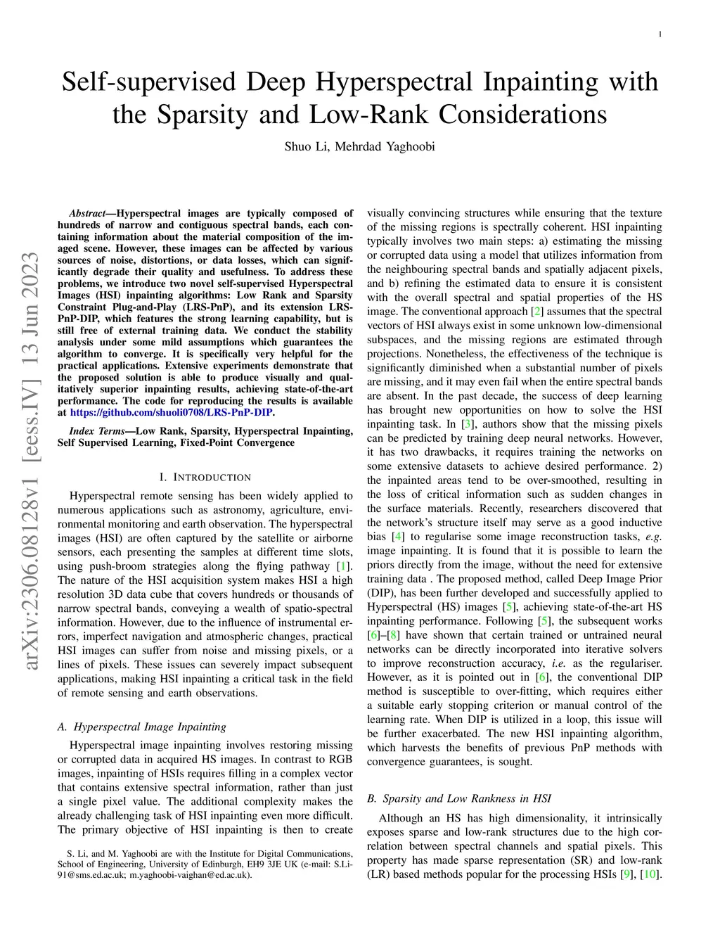 Hyperspectral images are typically composed of hundreds of narrow and contiguous spectral bands, each containing information about the material composition of the imaged scene. However, these images can be affected by various sources of noise, distortions, or data losses, which can significantly degrade their quality and usefulness. To address these problems, we introduce two novel self-supervised Hyperspectral Images (HSI) inpainting algorithms: Low Rank and Sparsity Constraint Plug-and-Play (LRS-PnP), and its extension LRS-PnP-DIP, which features the strong learning capability, but is still free of external training data. We conduct the stability analysis under some mild assumptions which guarantees the algorithm to converge. It is specifically very helpful for the practical applications. Extensive experiments demonstrate that the proposed solution is able to produce visually and qualitatively superior inpainting results, achieving state-of-the-art performance. The code for reproducing the results is available at \url{https://github.com/shuoli0708/LRS-PnP-DIP}.