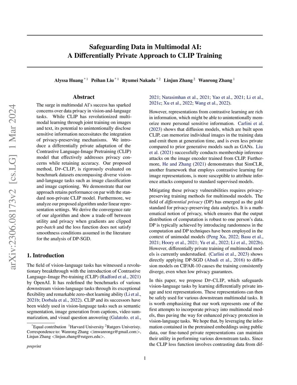 The surge in multimodal AI's success has sparked concerns over data privacy in vision-and-language tasks. While CLIP has revolutionized multimodal learning through joint training on images and text, its potential to unintentionally disclose sensitive information necessitates the integration of privacy-preserving mechanisms. We introduce a differentially private adaptation of the Contrastive Language-Image Pretraining (CLIP) model that effectively addresses privacy concerns while retaining accuracy. Our proposed method, Dp-CLIP, is rigorously evaluated on benchmark datasets encompassing diverse vision-and-language tasks such as image classification and visual question answering. We demonstrate that our approach retains performance on par with the standard non-private CLIP model. Furthermore, we analyze our proposed algorithm under linear representation settings. We derive the convergence rate of our algorithm and show a trade-off between utility and privacy when gradients are clipped per-batch and the loss function does not satisfy smoothness conditions assumed in the literature for the analysis of DP-SGD.