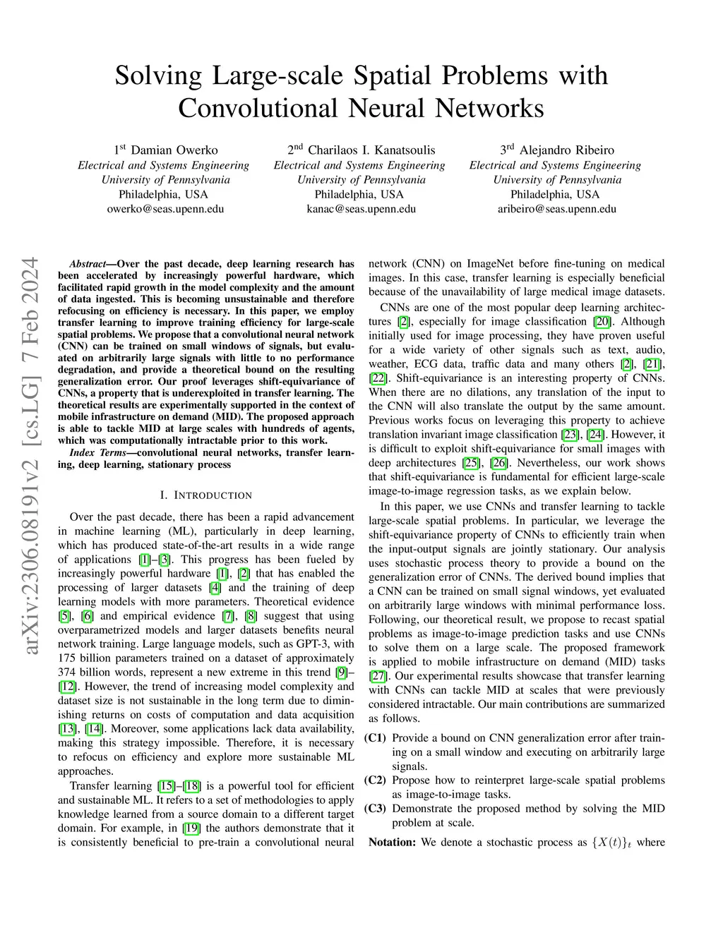 Over the past decade, deep learning research has been accelerated by increasingly powerful hardware, which facilitated rapid growth in the model complexity and the amount of data ingested. This is becoming unsustainable and therefore refocusing on efficiency is necessary. In this paper, we employ transfer learning to improve training efficiency for large-scale spatial problems. We propose that a convolutional neural network (CNN) can be trained on small windows of signals, but evaluated on arbitrarily large signals with little to no performance degradation, and provide a theoretical bound on the resulting generalization error. Our proof leverages shift-equivariance of CNNs, a property that is underexploited in transfer learning. The theoretical results are experimentally supported in the context of mobile infrastructure on demand (MID). The proposed approach is able to tackle MID at large scales with hundreds of agents, which was computationally intractable prior to this work.