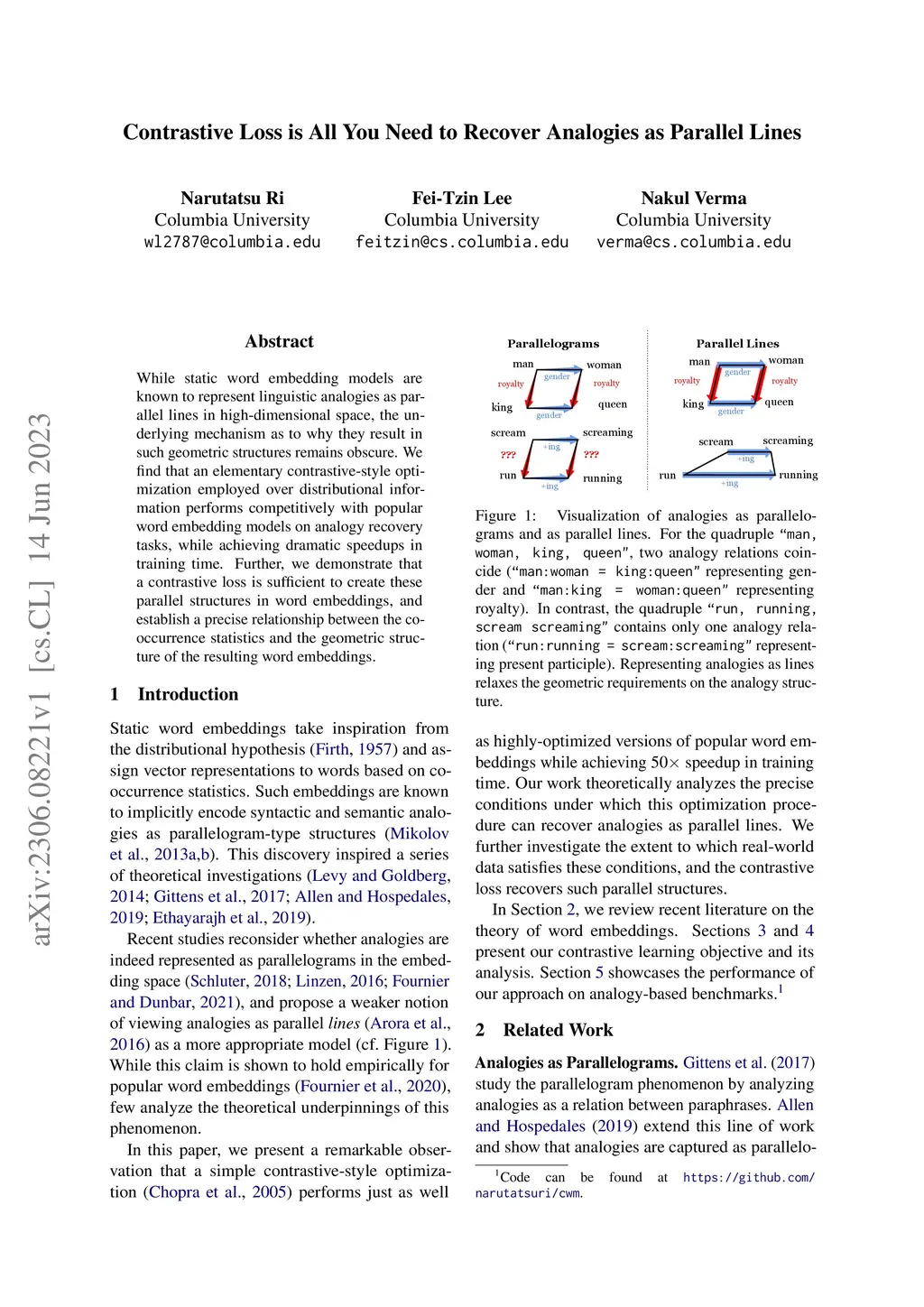 Contrastive Loss is All You Need to Recover Analogies as Parallel Lines