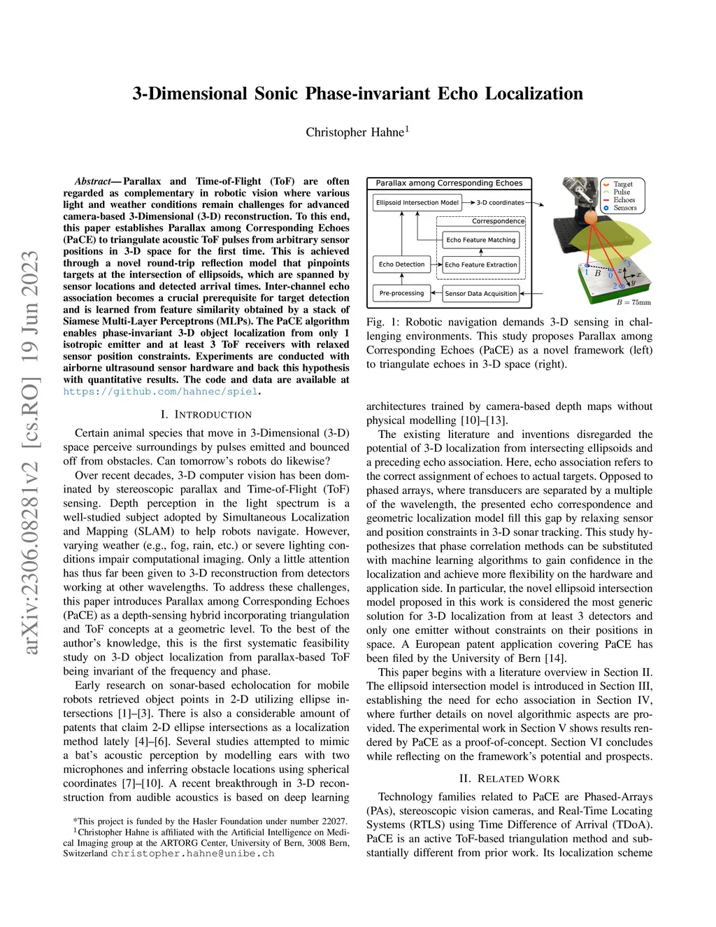 Parallax and Time-of-Flight (ToF) are often regarded as complementary in robotic vision where various light and weather conditions remain challenges for advanced camera-based 3-Dimensional (3-D) reconstruction. To this end, this paper establishes Parallax among Corresponding Echoes (PaCE) to triangulate acoustic ToF pulses from arbitrary sensor positions in 3-D space for the first time. This is achieved through a novel round-trip reflection model that pinpoints targets at the intersection of ellipsoids, which are spanned by sensor locations and detected arrival times. Inter-channel echo association becomes a crucial prerequisite for target detection and is learned from feature similarity obtained by a stack of Siamese Multi-Layer Perceptrons (MLPs). The PaCE algorithm enables phase-invariant 3-D object localization from only 1 isotropic emitter and at least 3 ToF receivers with relaxed sensor position constraints. Experiments are conducted with airborne ultrasound sensor hardware and back this hypothesis with quantitative results.