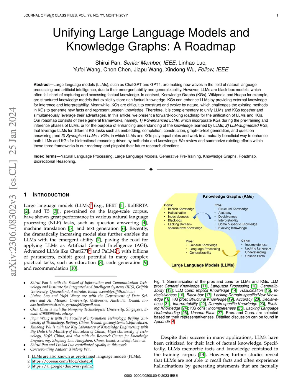 Large language models (LLMs), such as ChatGPT and GPT4, are making new waves in the field of natural language processing and artificial intelligence, due to their emergent ability and generalizability. However, LLMs are black-box models, which often fall short of capturing and accessing factual knowledge. In contrast, Knowledge Graphs (KGs), Wikipedia and Huapu for example, are structured knowledge models that explicitly store rich factual knowledge. KGs can enhance LLMs by providing external knowledge for inference and interpretability. Meanwhile, KGs are difficult to construct and evolving by nature, which challenges the existing methods in KGs to generate new facts and represent unseen knowledge. Therefore, it is complementary to unify LLMs and KGs together and simultaneously leverage their advantages. In this article, we present a forward-looking roadmap for the unification of LLMs and KGs. Our roadmap consists of three general frameworks, namely, 1) KG-enhanced LLMs, which incorporate KGs during the pre-training and inference phases of LLMs, or for the purpose of enhancing understanding of the knowledge learned by LLMs; 2) LLM-augmented KGs, that leverage LLMs for different KG tasks such as embedding, completion, construction, graph-to-text generation, and question answering; and 3) Synergized LLMs + KGs, in which LLMs and KGs play equal roles and work in a mutually beneficial way to enhance both LLMs and KGs for bidirectional reasoning driven by both data and knowledge. We review and summarize existing efforts within these three frameworks in our roadmap and pinpoint their future research directions.