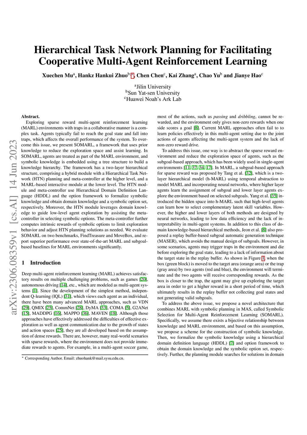 Exploring sparse reward multi-agent reinforcement learning (MARL) environments with traps in a collaborative manner is a complex task. Agents typically fail to reach the goal state and fall into traps, which affects the overall performance of the system. To overcome this issue, we present SOMARL, a framework that uses prior knowledge to reduce the exploration space and assist learning. In SOMARL, agents are treated as part of the MARL environment, and symbolic knowledge is embedded using a tree structure to build a knowledge hierarchy. The framework has a two-layer hierarchical structure, comprising a hybrid module with a Hierarchical Task Network (HTN) planning and meta-controller at the higher level, and a MARL-based interactive module at the lower level. The HTN module and meta-controller use Hierarchical Domain Definition Language (HDDL) and the option framework to formalize symbolic knowledge and obtain domain knowledge and a symbolic option set, respectively. Moreover, the HTN module leverages domain knowledge to guide low-level agent exploration by assisting the meta-controller in selecting symbolic options. The meta-controller further computes intrinsic rewards of symbolic options to limit exploration behavior and adjust HTN planning solutions as needed. We evaluate SOMARL on two benchmarks, FindTreasure and MoveBox, and report superior performance over state-of-the-art MARL and subgoal-based baselines for MARL environments significantly.