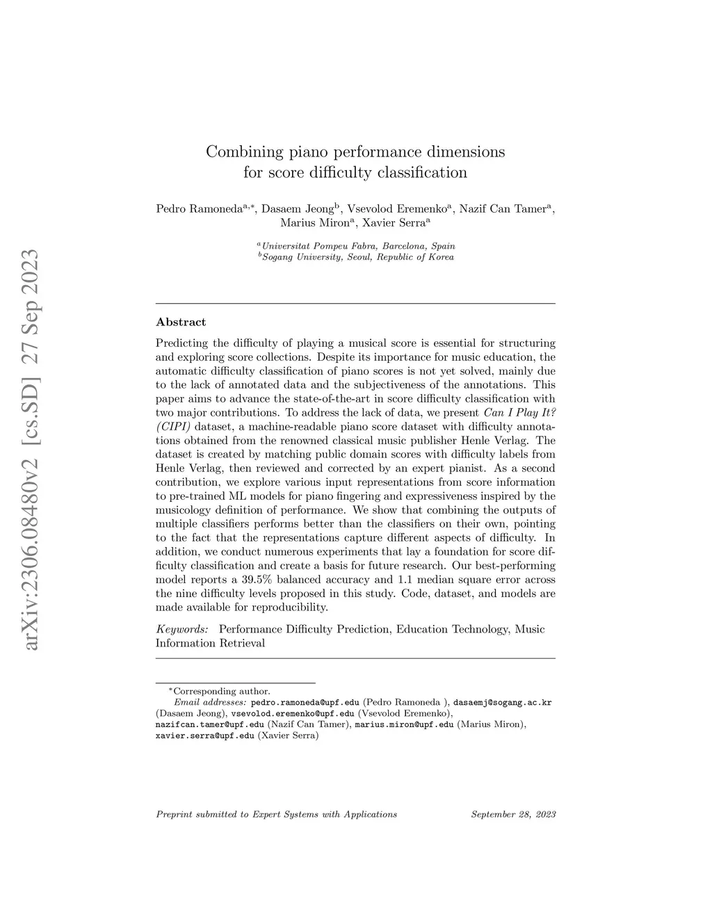 Predicting the difficulty of playing a musical score is essential for structuring and exploring score collections. Despite its importance for music education, the automatic difficulty classification of piano scores is not yet solved, mainly due to the lack of annotated data and the subjectiveness of the annotations. This paper aims to advance the state-of-the-art in score difficulty classification with two major contributions. To address the lack of data, we present Can I Play It? (CIPI) dataset, a machine-readable piano score dataset with difficulty annotations obtained from the renowned classical music publisher Henle Verlag. The dataset is created by matching public domain scores with difficulty labels from Henle Verlag, then reviewed and corrected by an expert pianist. As a second contribution, we explore various input representations from score information to pre-trained ML models for piano fingering and expressiveness inspired by the musicology definition of performance. We show that combining the outputs of multiple classifiers performs better than the classifiers on their own, pointing to the fact that the representations capture different aspects of difficulty. In addition, we conduct numerous experiments that lay a foundation for score difficulty classification and create a basis for future research. Our best-performing model reports a 39.47% balanced accuracy and 1.13 median square error across the nine difficulty levels proposed in this study. Code, dataset, and models are made available for reproducibility.