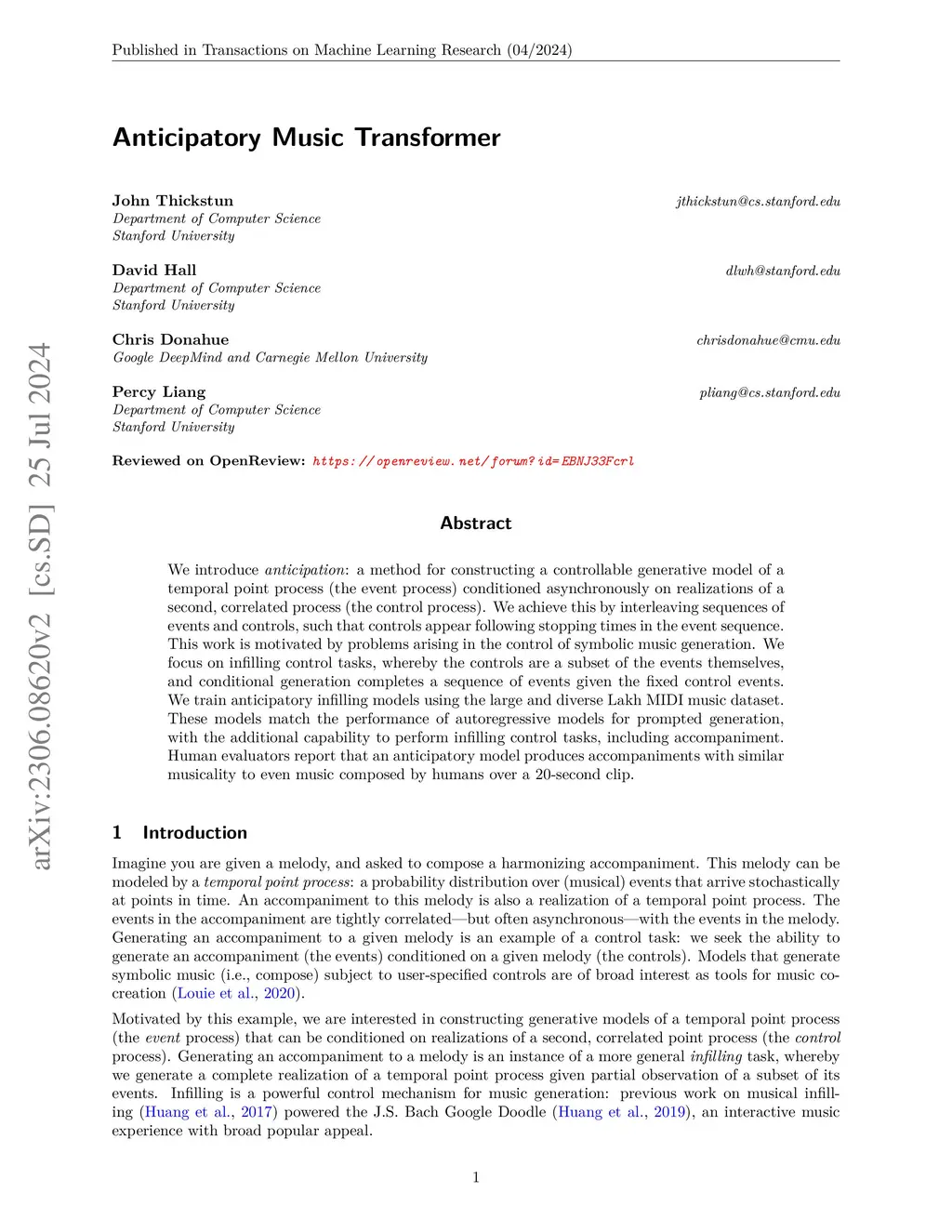 We introduce anticipation: a method for constructing a controllable generative model of a temporal point process (the event process) conditioned asynchronously on realizations of a second, correlated process (the control process). We achieve this by interleaving sequences of events and controls, such that controls appear following stopping times in the event sequence. This work is motivated by problems arising in the control of symbolic music generation. We focus on infilling control tasks, whereby the controls are a subset of the events themselves, and conditional generation completes a sequence of events given the fixed control events. We train anticipatory infilling models using the large and diverse Lakh MIDI music dataset. These models match the performance of autoregressive models for prompted music generation, with the additional capability to perform infilling control tasks, including accompaniment. Human evaluators report that an anticipatory model produces accompaniments with similar musicality to even music composed by humans over a 20-second clip.
