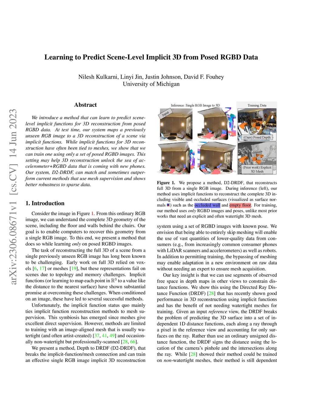 We introduce a method that can learn to predict scene-level implicit functions for 3D reconstruction from posed RGBD data. At test time, our system maps a previously unseen RGB image to a 3D reconstruction of a scene via implicit functions. While implicit functions for 3D reconstruction have often been tied to meshes, we show that we can train one using only a set of posed RGBD images. This setting may help 3D reconstruction unlock the sea of accelerometer+RGBD data that is coming with new phones. Our system, D2-DRDF, can match and sometimes outperform current methods that use mesh supervision and shows better robustness to sparse data.