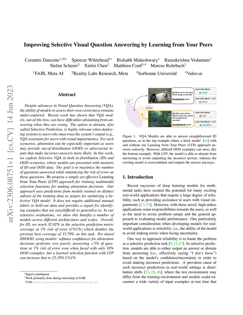 Despite advances in Visual Question Answering (VQA), the ability of models to assess their own correctness remains underexplored. Recent work has shown that VQA models, out-of-the-box, can have difficulties abstaining from answering when they are wrong. The option to abstain, also called Selective Prediction, is highly relevant when deploying systems to users who must trust the system's output (e.g., VQA assistants for users with visual impairments). For such scenarios, abstention can be especially important as users may provide out-of-distribution (OOD) or adversarial inputs that make incorrect answers more likely. In this work, we explore Selective VQA in both in-distribution (ID) and OOD scenarios, where models are presented with mixtures of ID and OOD data. The goal is to maximize the number of questions answered while minimizing the risk of error on those questions. We propose a simple yet effective Learning from Your Peers (LYP) approach for training multimodal selection functions for making abstention decisions. Our approach uses predictions from models trained on distinct subsets of the training data as targets for optimizing a Selective VQA model. It does not require additional manual labels or held-out data and provides a signal for identifying examples that are easy/difficult to generalize to. In our extensive evaluations, we show this benefits a number of models across different architectures and scales. Overall, for ID, we reach 32.92% in the selective prediction metric coverage at 1% risk of error (C@1%) which doubles the previous best coverage of 15.79% on this task. For mixed ID/OOD, using models' softmax confidences for abstention decisions performs very poorly, answering <5% of questions at 1% risk of error even when faced with only 10% OOD examples, but a learned selection function with LYP can increase that to 25.38% C@1%.