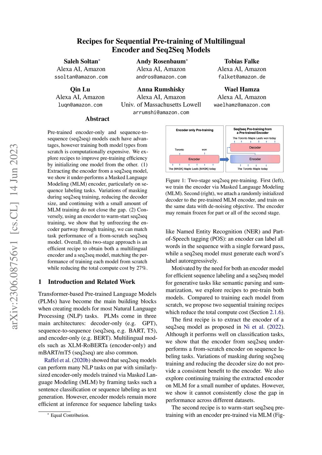 Pre-trained encoder-only and sequence-to-sequence (seq2seq) models each have advantages, however training both model types from scratch is computationally expensive. We explore recipes to improve pre-training efficiency by initializing one model from the other. (1) Extracting the encoder from a seq2seq model, we show it under-performs a Masked Language Modeling (MLM) encoder, particularly on sequence labeling tasks. Variations of masking during seq2seq training, reducing the decoder size, and continuing with a small amount of MLM training do not close the gap. (2) Conversely, using an encoder to warm-start seq2seq training, we show that by unfreezing the encoder partway through training, we can match task performance of a from-scratch seq2seq model. Overall, this two-stage approach is an efficient recipe to obtain both a multilingual encoder and a seq2seq model, matching the performance of training each model from scratch while reducing the total compute cost by 27%.