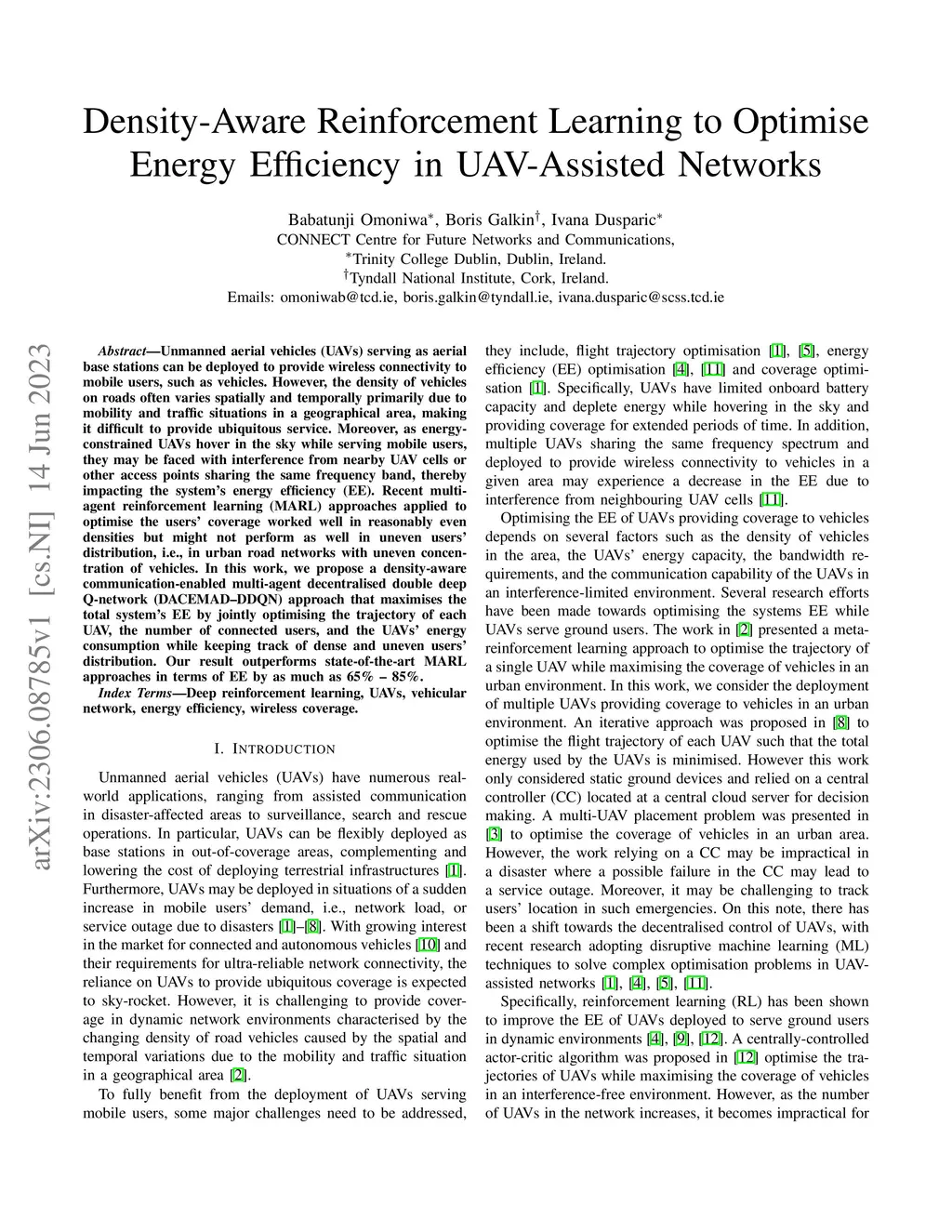 Unmanned aerial vehicles (UAVs) serving as aerial base stations can be deployed to provide wireless connectivity to mobile users, such as vehicles. However, the density of vehicles on roads often varies spatially and temporally primarily due to mobility and traffic situations in a geographical area, making it difficult to provide ubiquitous service. Moreover, as energy-constrained UAVs hover in the sky while serving mobile users, they may be faced with interference from nearby UAV cells or other access points sharing the same frequency band, thereby impacting the system's energy efficiency (EE). Recent multi-agent reinforcement learning (MARL) approaches applied to optimise the users' coverage worked well in reasonably even densities but might not perform as well in uneven users' distribution, i.e., in urban road networks with uneven concentration of vehicles. In this work, we propose a density-aware communication-enabled multi-agent decentralised double deep Q-network (DACEMAD-DDQN) approach that maximises the total system's EE by jointly optimising the trajectory of each UAV, the number of connected users, and the UAVs' energy consumption while keeping track of dense and uneven users' distribution. Our result outperforms state-of-the-art MARL approaches in terms of EE by as much as 65% - 85%.