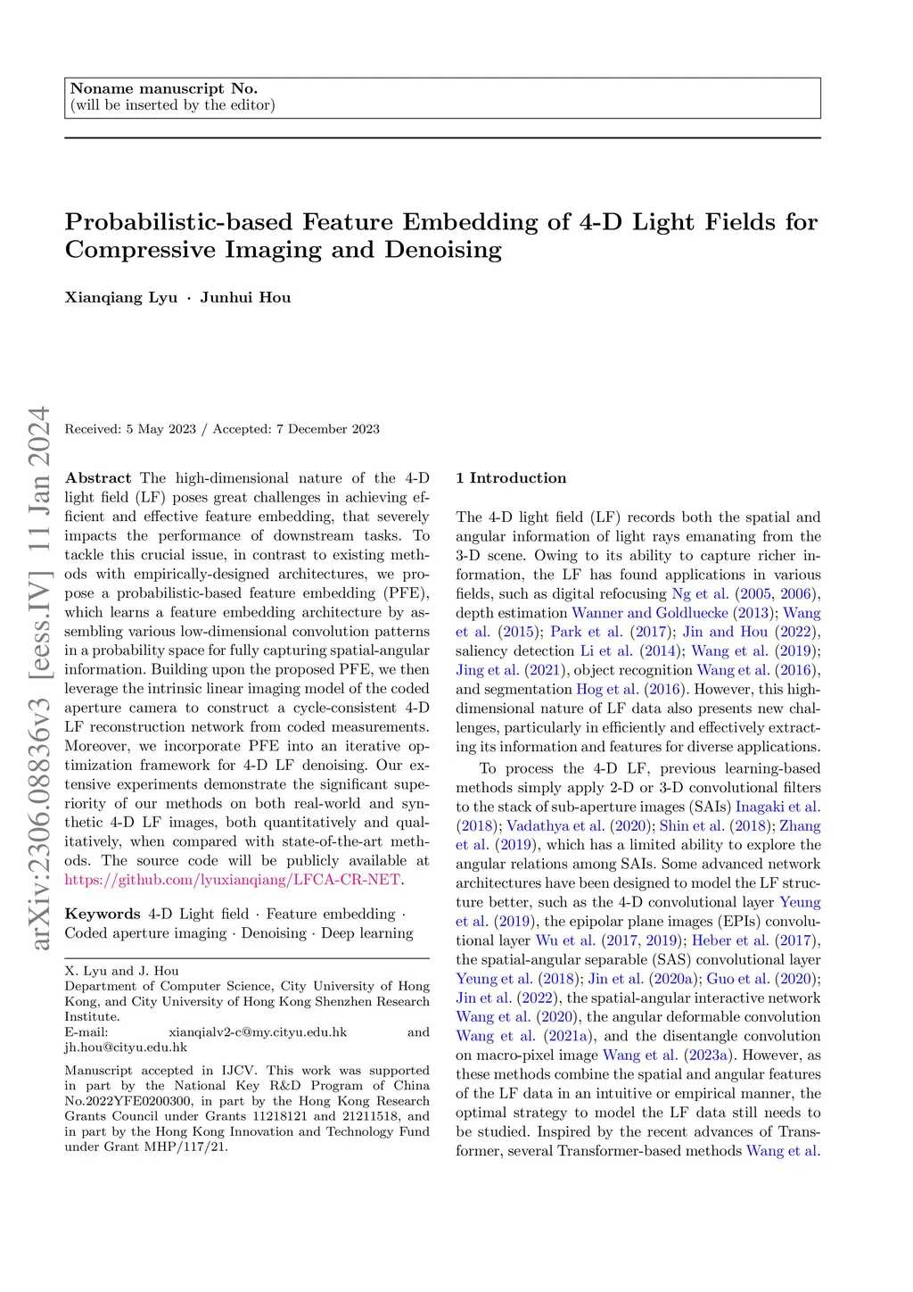 The high-dimensional nature of the 4-D light field (LF) poses great challenges in achieving efficient and effective feature embedding, that severely impacts the performance of downstream tasks. To tackle this crucial issue, in contrast to existing methods with empirically-designed architectures, we propose a probabilistic-based feature embedding (PFE), which learns a feature embedding architecture by assembling various low-dimensional convolution patterns in a probability space for fully capturing spatial-angular information. Building upon the proposed PFE, we then leverage the intrinsic linear imaging model of the coded aperture camera to construct a cycle-consistent 4-D LF reconstruction network from coded measurements. Moreover, we incorporate PFE into an iterative optimization framework for 4-D LF denoising. Our extensive experiments demonstrate the significant superiority of our methods on both real-world and synthetic 4-D LF images, both quantitatively and qualitatively, when compared with state-of-the-art methods. The source code will be publicly available at https://github.com/lyuxianqiang/LFCA-CR-NET.