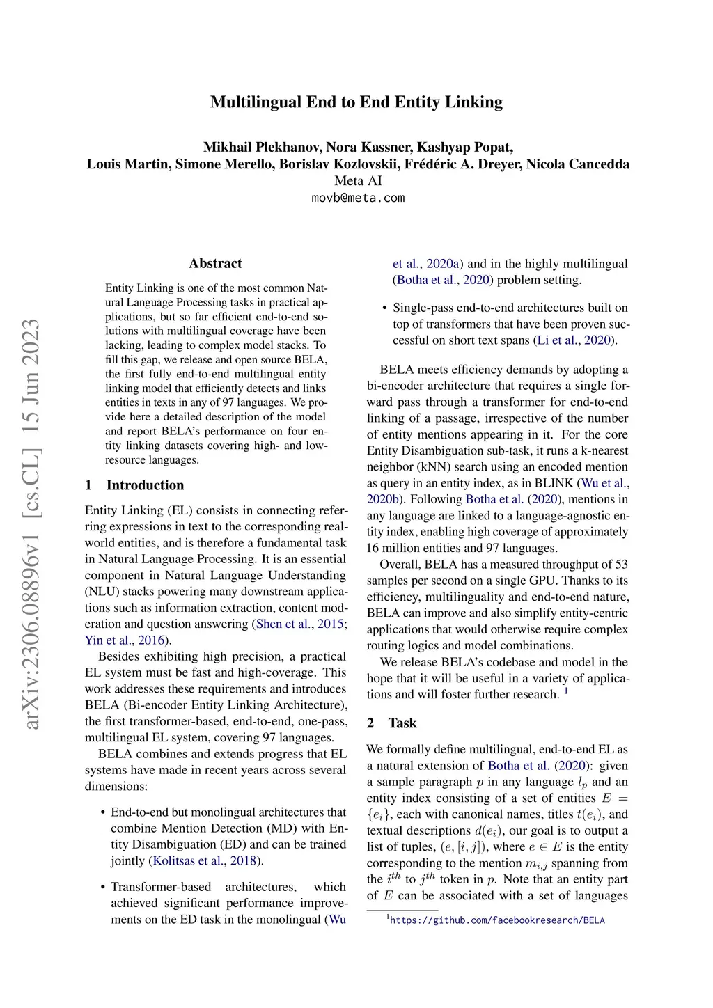 Entity Linking is one of the most common Natural Language Processing tasks in practical applications, but so far efficient end-to-end solutions with multilingual coverage have been lacking, leading to complex model stacks. To fill this gap, we release and open source BELA, the first fully end-to-end multilingual entity linking model that efficiently detects and links entities in texts in any of 97 languages. We provide here a detailed description of the model and report BELA's performance on four entity linking datasets covering high- and low-resource languages.