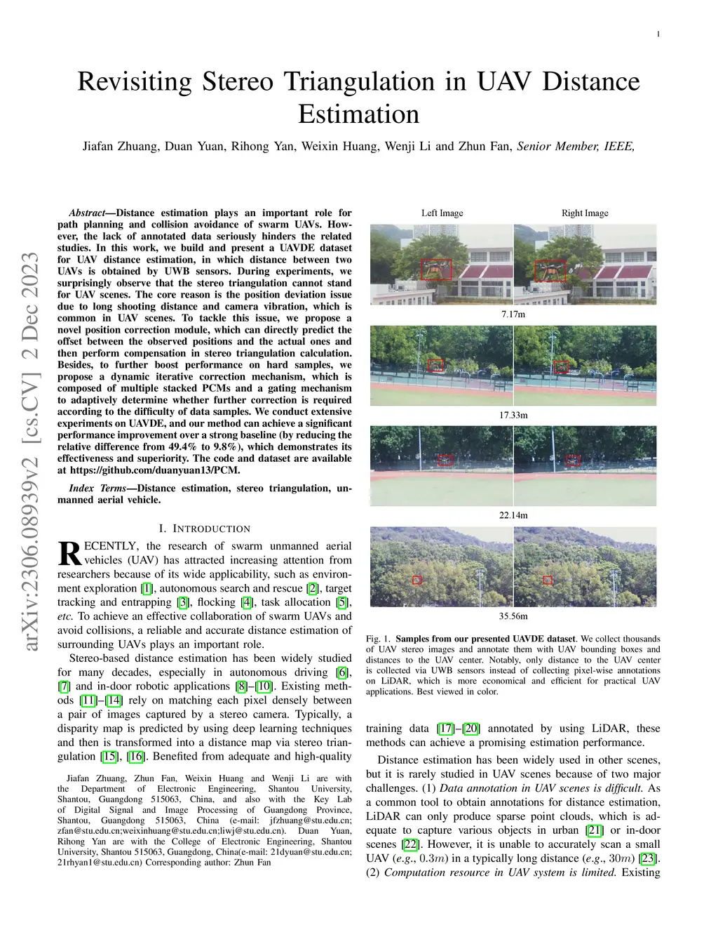 Distance estimation plays an important role for path planning and collision avoidance of swarm UAVs. However, the lack of annotated data seriously hinders the related studies. In this work, we build and present a UAVDE dataset for UAV distance estimation, in which distance between two UAVs is obtained by UWB sensors. During experiments, we surprisingly observe that the stereo triangulation cannot stand for UAV scenes. The core reason is the position deviation issue due to long shooting distance and camera vibration, which is common in UAV scenes. To tackle this issue, we propose a novel position correction module, which can directly predict the offset between the observed positions and the actual ones and then perform compensation in stereo triangulation calculation. Besides, to further boost performance on hard samples, we propose a dynamic iterative correction mechanism, which is composed of multiple stacked PCMs and a gating mechanism to adaptively determine whether further correction is required according to the difficulty of data samples. We conduct extensive experiments on UAVDE, and our method can achieve a significant performance improvement over a strong baseline (by reducing the relative difference from 49.4% to 9.8%), which demonstrates its effectiveness and superiority. The code and dataset are available at https://github.com/duanyuan13/PCM.