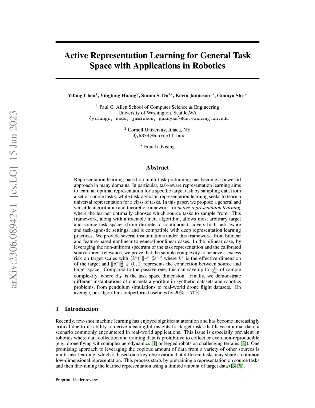 Representation learning based on multi-task pretraining has become a powerful approach in many domains. In particular, task-aware representation learning aims to learn an optimal representation for a specific target task by sampling data from a set of source tasks, while task-agnostic representation learning seeks to learn a universal representation for a class of tasks. In this paper, we propose a general and versatile algorithmic and theoretic framework for \textit{active representation learning}, where the learner optimally chooses which source tasks to sample from. This framework, along with a tractable meta algorithm, allows most arbitrary target and source task spaces (from discrete to continuous), covers both task-aware and task-agnostic settings, and is compatible with deep representation learning practices. We provide several instantiations under this framework, from bilinear and feature-based nonlinear to general nonlinear cases. In the bilinear case, by leveraging the non-uniform spectrum of the task representation and the calibrated source-target relevance, we prove that the sample complexity to achieve -excess risk on target scales with $ (k^*)^2 \|v^*\|_2^2 \varepsilon^{-2}$ where is the effective dimension of the target and represents the connection between source and target space. Compared to the passive one, this can save up to of sample complexity, where is the task space dimension. Finally, we demonstrate different instantiations of our meta algorithm in synthetic datasets and robotics problems, from pendulum simulations to real-world drone flight datasets. On average, our algorithms outperform baselines by .