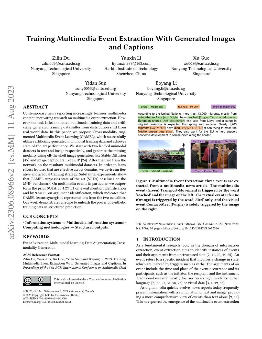 Contemporary news reporting increasingly features multimedia content, motivating research on multimedia event extraction. However, the task lacks annotated multimodal training data and artificially generated training data suffer from distribution shift from real-world data. In this paper, we propose Cross-modality Augmented Multimedia Event Learning (CAMEL), which successfully utilizes artificially generated multimodal training data and achieves state-of-the-art performance. We start with two labeled unimodal datasets in text and image respectively, and generate the missing modality using off-the-shelf image generators like Stable Diffusion and image captioners like BLIP. After that, we train the network on the resultant multimodal datasets. In order to learn robust features that are effective across domains, we devise an iterative and gradual training strategy. Substantial experiments show that CAMEL surpasses state-of-the-art (SOTA) baselines on the M2E2 benchmark. On multimedia events in particular, we outperform the prior SOTA by 4.2% F1 on event mention identification and by 9.8% F1 on argument identification, which indicates that CAMEL learns synergistic representations from the two modalities. Our work demonstrates a recipe to unleash the power of synthetic training data in structured prediction.