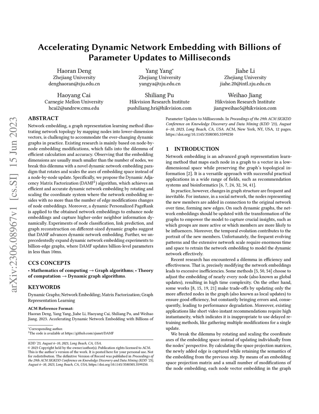Network embedding, a graph representation learning method illustrating network topology by mapping nodes into lower-dimension vectors, is challenging to accommodate the ever-changing dynamic graphs in practice. Existing research is mainly based on node-by-node embedding modifications, which falls into the dilemma of efficient calculation and accuracy. Observing that the embedding dimensions are usually much smaller than the number of nodes, we break this dilemma with a novel dynamic network embedding paradigm that rotates and scales the axes of embedding space instead of a node-by-node update. Specifically, we propose the Dynamic Adjacency Matrix Factorization (DAMF) algorithm, which achieves an efficient and accurate dynamic network embedding by rotating and scaling the coordinate system where the network embedding resides with no more than the number of edge modifications changes of node embeddings. Moreover, a dynamic Personalized PageRank is applied to the obtained network embeddings to enhance node embeddings and capture higher-order neighbor information dynamically. Experiments of node classification, link prediction, and graph reconstruction on different-sized dynamic graphs suggest that DAMF advances dynamic network embedding. Further, we unprecedentedly expand dynamic network embedding experiments to billion-edge graphs, where DAMF updates billion-level parameters in less than 10ms.