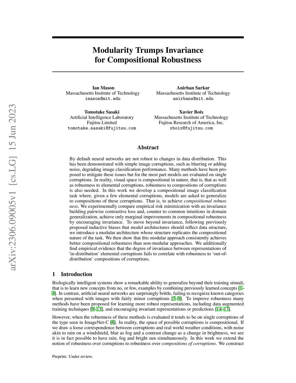By default neural networks are not robust to changes in data distribution. This has been demonstrated with simple image corruptions, such as blurring or adding noise, degrading image classification performance. Many methods have been proposed to mitigate these issues but for the most part models are evaluated on single corruptions. In reality, visual space is compositional in nature, that is, that as well as robustness to elemental corruptions, robustness to compositions of corruptions is also needed. In this work we develop a compositional image classification task where, given a few elemental corruptions, models are asked to generalize to compositions of these corruptions. That is, to achieve compositional robustness. We experimentally compare empirical risk minimization with an invariance building pairwise contrastive loss and, counter to common intuitions in domain generalization, achieve only marginal improvements in compositional robustness by encouraging invariance. To move beyond invariance, following previously proposed inductive biases that model architectures should reflect data structure, we introduce a modular architecture whose structure replicates the compositional nature of the task. We then show that this modular approach consistently achieves better compositional robustness than non-modular approaches. We additionally find empirical evidence that the degree of invariance between representations of ín-distribution' elemental corruptions fails to correlate with robustness to óut-of-distribution' compositions of corruptions.