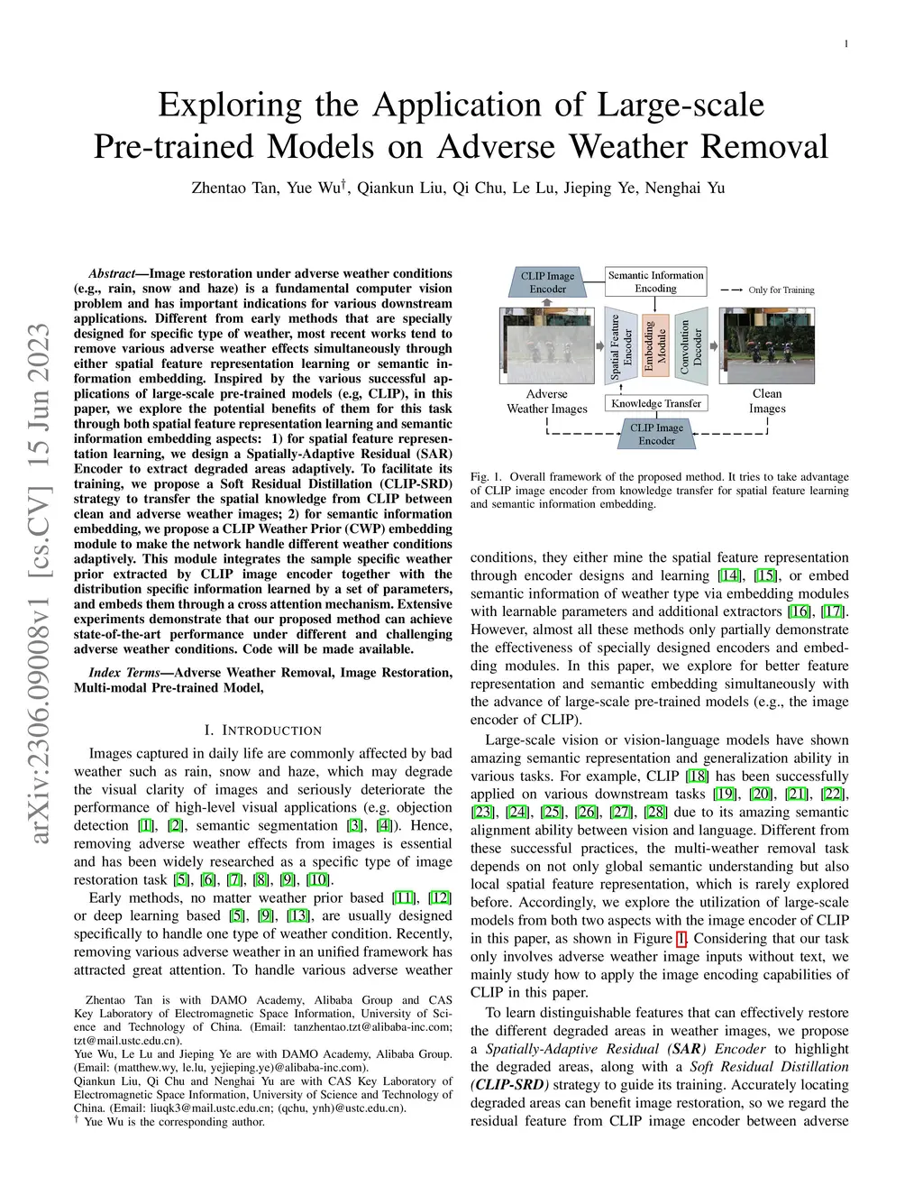 Image restoration under adverse weather conditions (e.g., rain, snow and haze) is a fundamental computer vision problem and has important indications for various downstream applications. Different from early methods that are specially designed for specific type of weather, most recent works tend to remove various adverse weather effects simultaneously through either spatial feature representation learning or semantic information embedding. Inspired by the various successful applications of large-scale pre-trained models (e.g, CLIP), in this paper, we explore the potential benefits of them for this task through both spatial feature representation learning and semantic information embedding aspects: 1) for spatial feature representation learning, we design a Spatially-Adaptive Residual (\textbf{SAR}) Encoder to extract degraded areas adaptively. To facilitate its training, we propose a Soft Residual Distillation (\textbf{CLIP-SRD}) strategy to transfer the spatial knowledge from CLIP between clean and adverse weather images; 2) for semantic information embedding, we propose a CLIP Weather Prior (\textbf{CWP}) embedding module to make the network handle different weather conditions adaptively. This module integrates the sample specific weather prior extracted by CLIP image encoder together with the distribution specific information learned by a set of parameters, and embeds them through a cross attention mechanism. Extensive experiments demonstrate that our proposed method can achieve state-of-the-art performance under different and challenging adverse weather conditions. Code will be made available.