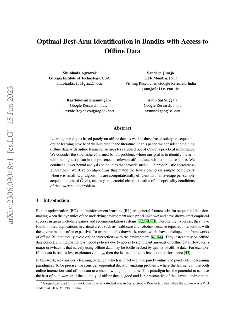 Learning paradigms based purely on offline data as well as those based solely on sequential online learning have been well-studied in the literature. In this paper, we consider combining offline data with online learning, an area less studied but of obvious practical importance. We consider the stochastic -armed bandit problem, where our goal is to identify the arm with the highest mean in the presence of relevant offline data, with confidence . We conduct a lower bound analysis on policies that provide such probabilistic correctness guarantees. We develop algorithms that match the lower bound on sample complexity when is small. Our algorithms are computationally efficient with an average per-sample acquisition cost of , and rely on a careful characterization of the optimality conditions of the lower bound problem.