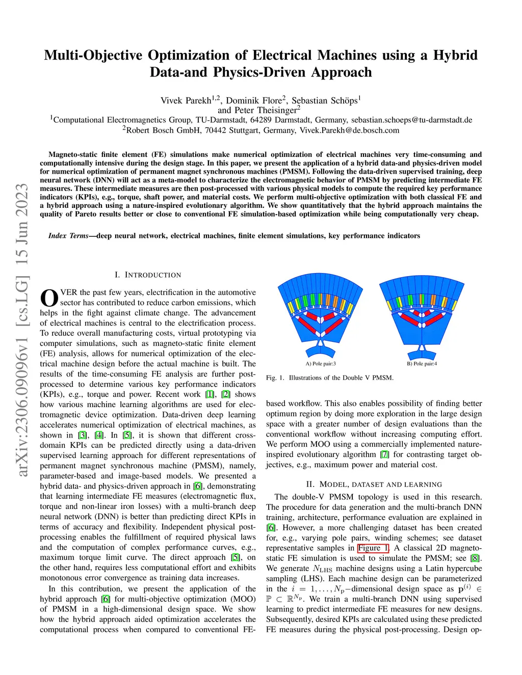 Magneto-static finite element (FE) simulations make numerical optimization of electrical machines very time-consuming and computationally intensive during the design stage. In this paper, we present the application of a hybrid data-and physics-driven model for numerical optimization of permanent magnet synchronous machines (PMSM). Following the data-driven supervised training, deep neural network (DNN) will act as a meta-model to characterize the electromagnetic behavior of PMSM by predicting intermediate FE measures. These intermediate measures are then post-processed with various physical models to compute the required key performance indicators (KPIs), e.g., torque, shaft power, and material costs. We perform multi-objective optimization with both classical FE and a hybrid approach using a nature-inspired evolutionary algorithm. We show quantitatively that the hybrid approach maintains the quality of Pareto results better or close to conventional FE simulation-based optimization while being computationally very cheap.