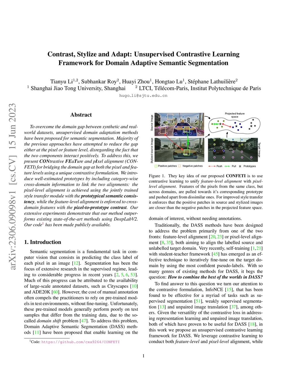 To overcome the domain gap between synthetic and real-world datasets, unsupervised domain adaptation methods have been proposed for semantic segmentation. Majority of the previous approaches have attempted to reduce the gap either at the pixel or feature level, disregarding the fact that the two components interact positively. To address this, we present CONtrastive FEaTure and pIxel alignment (CONFETI) for bridging the domain gap at both the pixel and feature levels using a unique contrastive formulation. We introduce well-estimated prototypes by including category-wise cross-domain information to link the two alignments: the pixel-level alignment is achieved using the jointly trained style transfer module with the prototypical semantic consistency, while the feature-level alignment is enforced to cross-domain features with the \textbf{pixel-to-prototype contrast}. Our extensive experiments demonstrate that our method outperforms existing state-of-the-art methods using DeepLabV2. Our code is available at https://github.com/cxa9264/CONFETI