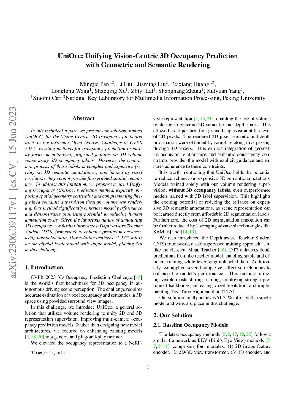 In this technical report, we present our solution, named UniOCC, for the Vision-Centric 3D occupancy prediction track in the nuScenes Open Dataset Challenge at CVPR 2023. Existing methods for occupancy prediction primarily focus on optimizing projected features on 3D volume space using 3D occupancy labels. However, the generation process of these labels is complex and expensive (relying on 3D semantic annotations), and limited by voxel resolution, they cannot provide fine-grained spatial semantics. To address this limitation, we propose a novel Unifying Occupancy (UniOcc) prediction method, explicitly imposing spatial geometry constraint and complementing fine-grained semantic supervision through volume ray rendering. Our method significantly enhances model performance and demonstrates promising potential in reducing human annotation costs. Given the laborious nature of annotating 3D occupancy, we further introduce a Depth-aware Teacher Student (DTS) framework to enhance prediction accuracy using unlabeled data. Our solution achieves 51.27\% mIoU on the official leaderboard with single model, placing 3rd in this challenge.
