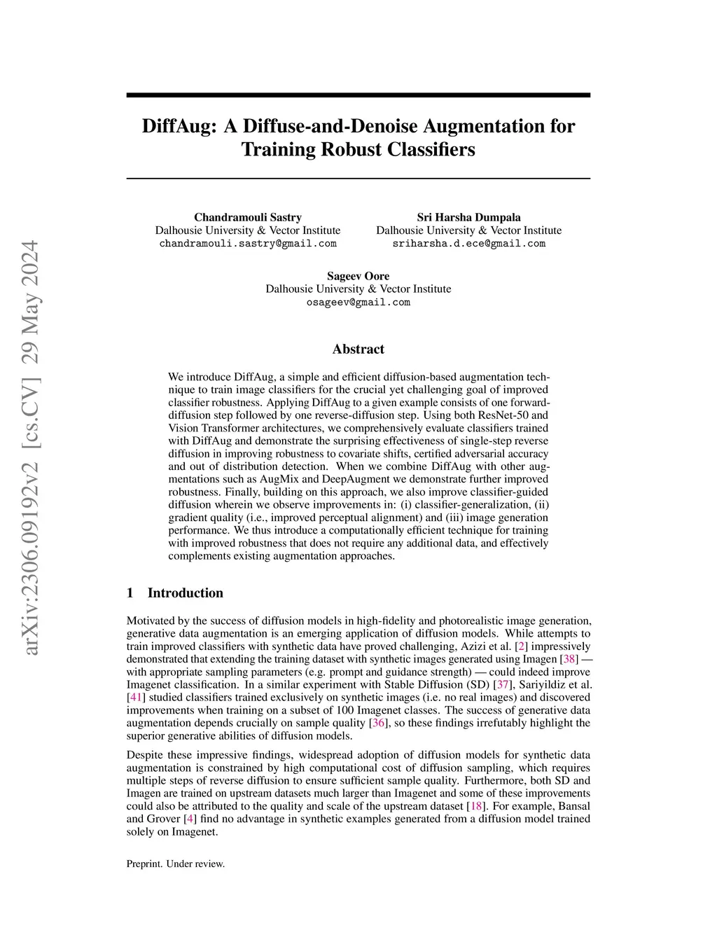 We introduce DiffAug, a simple and efficient diffusion-based augmentation technique to train image classifiers for the crucial yet challenging goal of improved classifier robustness. Applying DiffAug to a given example consists of one forward-diffusion step followed by one reverse-diffusion step. Using both ResNet-50 and Vision Transformer architectures, we comprehensively evaluate classifiers trained with DiffAug and demonstrate the surprising effectiveness of single-step reverse diffusion in improving robustness to covariate shifts, certified adversarial accuracy and out of distribution detection. When we combine DiffAug with other augmentations such as AugMix and DeepAugment we demonstrate further improved robustness. Finally, building on this approach, we also improve classifier-guided diffusion wherein we observe improvements in: (i) classifier-generalization, (ii) gradient quality (i.e., improved perceptual alignment) and (iii) image generation performance. We thus introduce a computationally efficient technique for training with improved robustness that does not require any additional data, and effectively complements existing augmentation approaches.