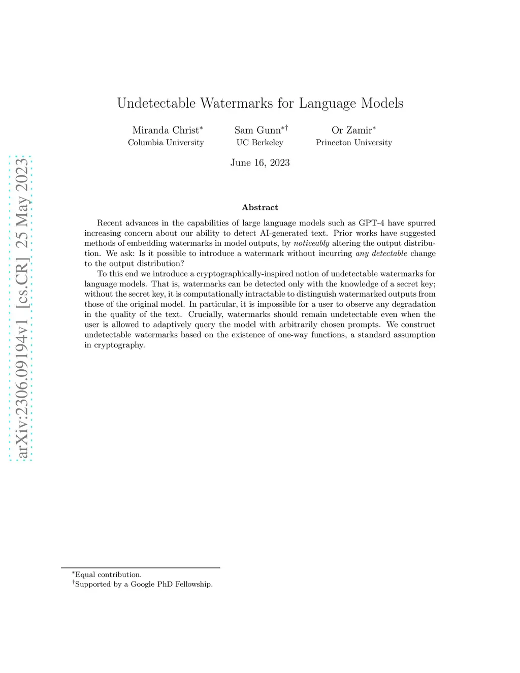 Recent advances in the capabilities of large language models such as GPT-4 have spurred increasing concern about our ability to detect AI-generated text. Prior works have suggested methods of embedding watermarks in model outputs, by noticeably altering the output distribution. We ask: Is it possible to introduce a watermark without incurring any detectable change to the output distribution? To this end we introduce a cryptographically-inspired notion of undetectable watermarks for language models. That is, watermarks can be detected only with the knowledge of a secret key; without the secret key, it is computationally intractable to distinguish watermarked outputs from those of the original model. In particular, it is impossible for a user to observe any degradation in the quality of the text. Crucially, watermarks should remain undetectable even when the user is allowed to adaptively query the model with arbitrarily chosen prompts. We construct undetectable watermarks based on the existence of one-way functions, a standard assumption in cryptography.