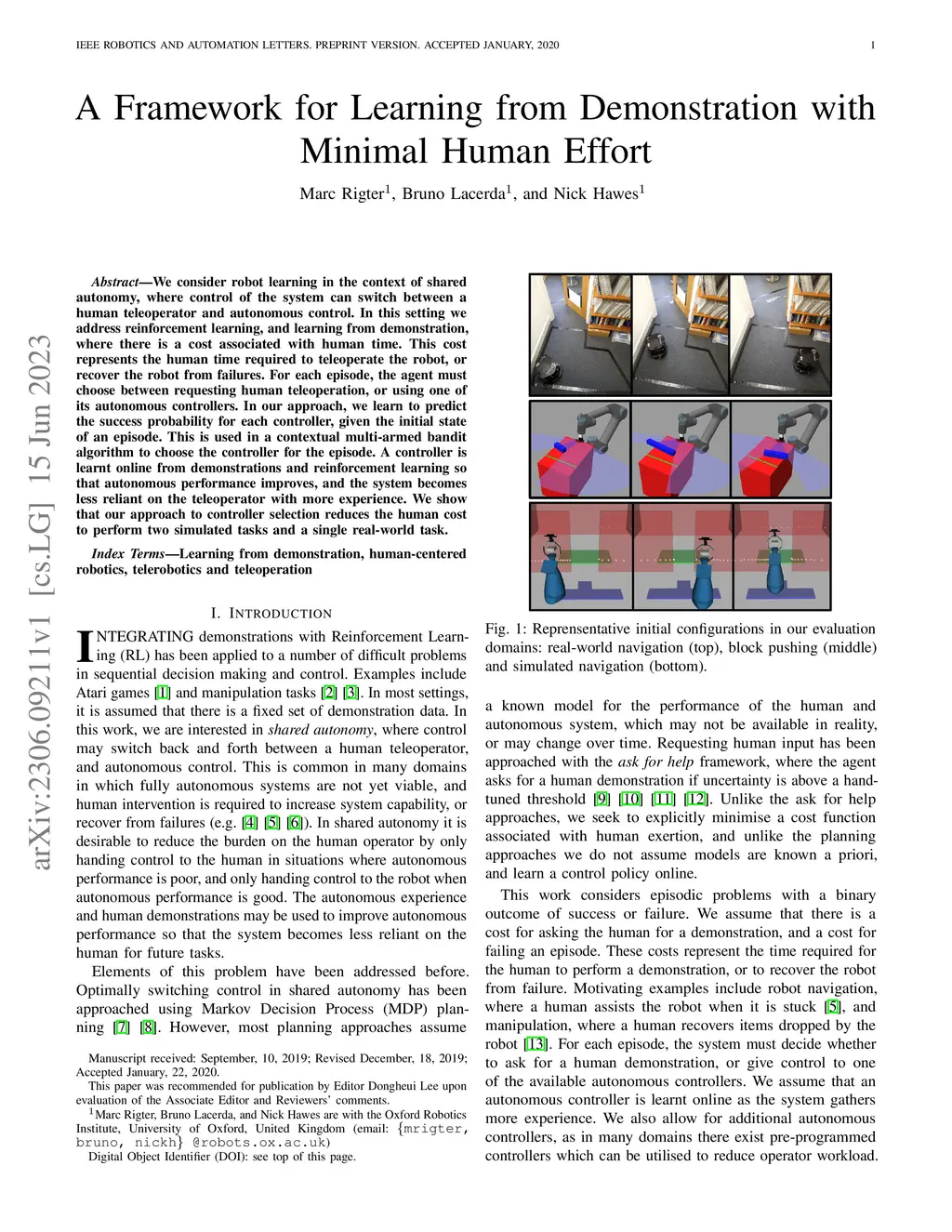 We consider robot learning in the context of shared autonomy, where control of the system can switch between a human teleoperator and autonomous control. In this setting we address reinforcement learning, and learning from demonstration, where there is a cost associated with human time. This cost represents the human time required to teleoperate the robot, or recover the robot from failures. For each episode, the agent must choose between requesting human teleoperation, or using one of its autonomous controllers. In our approach, we learn to predict the success probability for each controller, given the initial state of an episode. This is used in a contextual multi-armed bandit algorithm to choose the controller for the episode. A controller is learnt online from demonstrations and reinforcement learning so that autonomous performance improves, and the system becomes less reliant on the teleoperator with more experience. We show that our approach to controller selection reduces the human cost to perform two simulated tasks and a single real-world task.