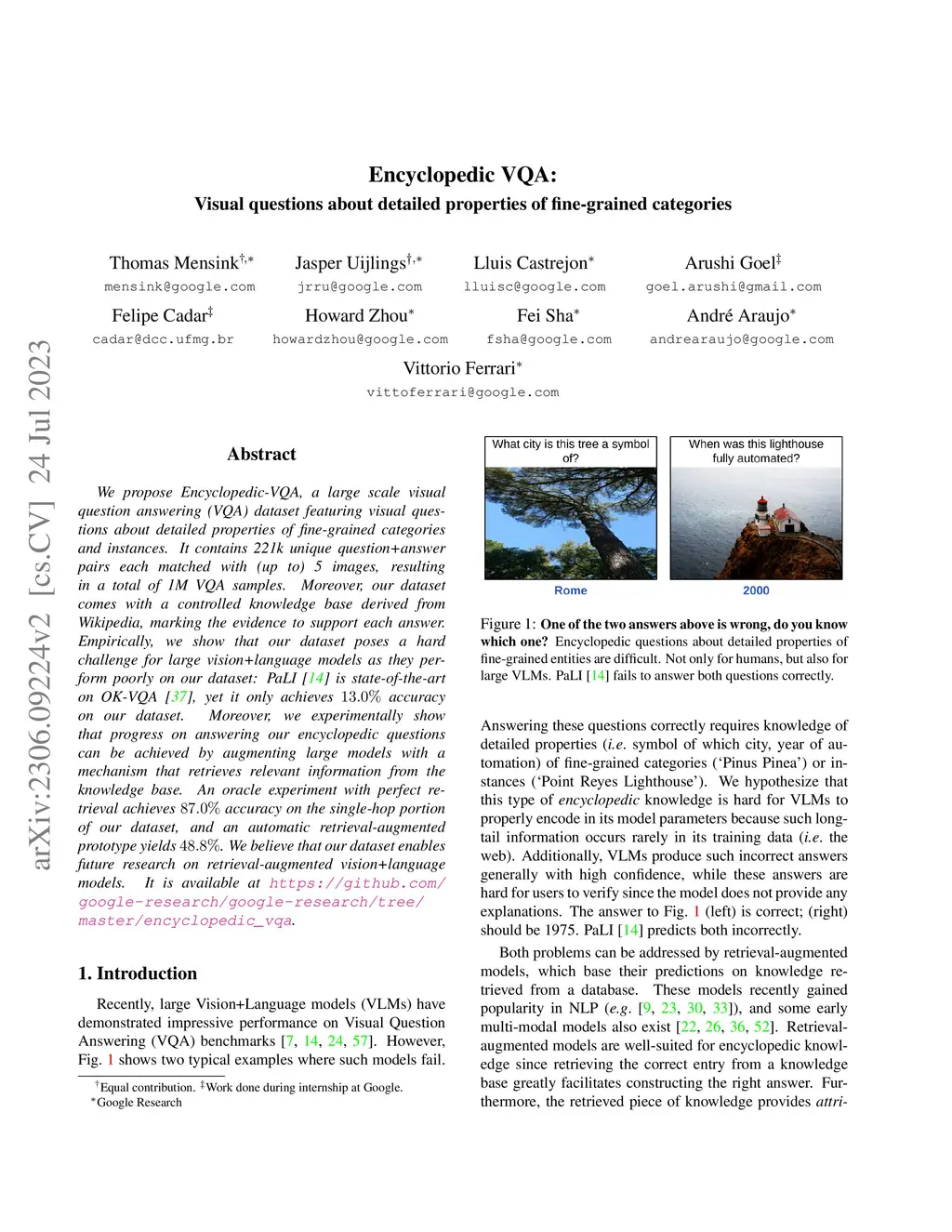 We propose Encyclopedic-VQA, a large scale visual question answering (VQA) dataset featuring visual questions about detailed properties of fine-grained categories and instances. It contains 221k unique question+answer pairs each matched with (up to) 5 images, resulting in a total of 1M VQA samples. Moreover, our dataset comes with a controlled knowledge base derived from Wikipedia, marking the evidence to support each answer. Empirically, we show that our dataset poses a hard challenge for large vision+language models as they perform poorly on our dataset: PaLI [14] is state-of-the-art on OK-VQA [37], yet it only achieves 13.0% accuracy on our dataset. Moreover, we experimentally show that progress on answering our encyclopedic questions can be achieved by augmenting large models with a mechanism that retrieves relevant information from the knowledge base. An oracle experiment with perfect retrieval achieves 87.0% accuracy on the single-hop portion of our dataset, and an automatic retrieval-augmented prototype yields 48.8%. We believe that our dataset enables future research on retrieval-augmented vision+language models. It is available at https://github.com/google-research/google-research/tree/master/encyclopedic_vqa .