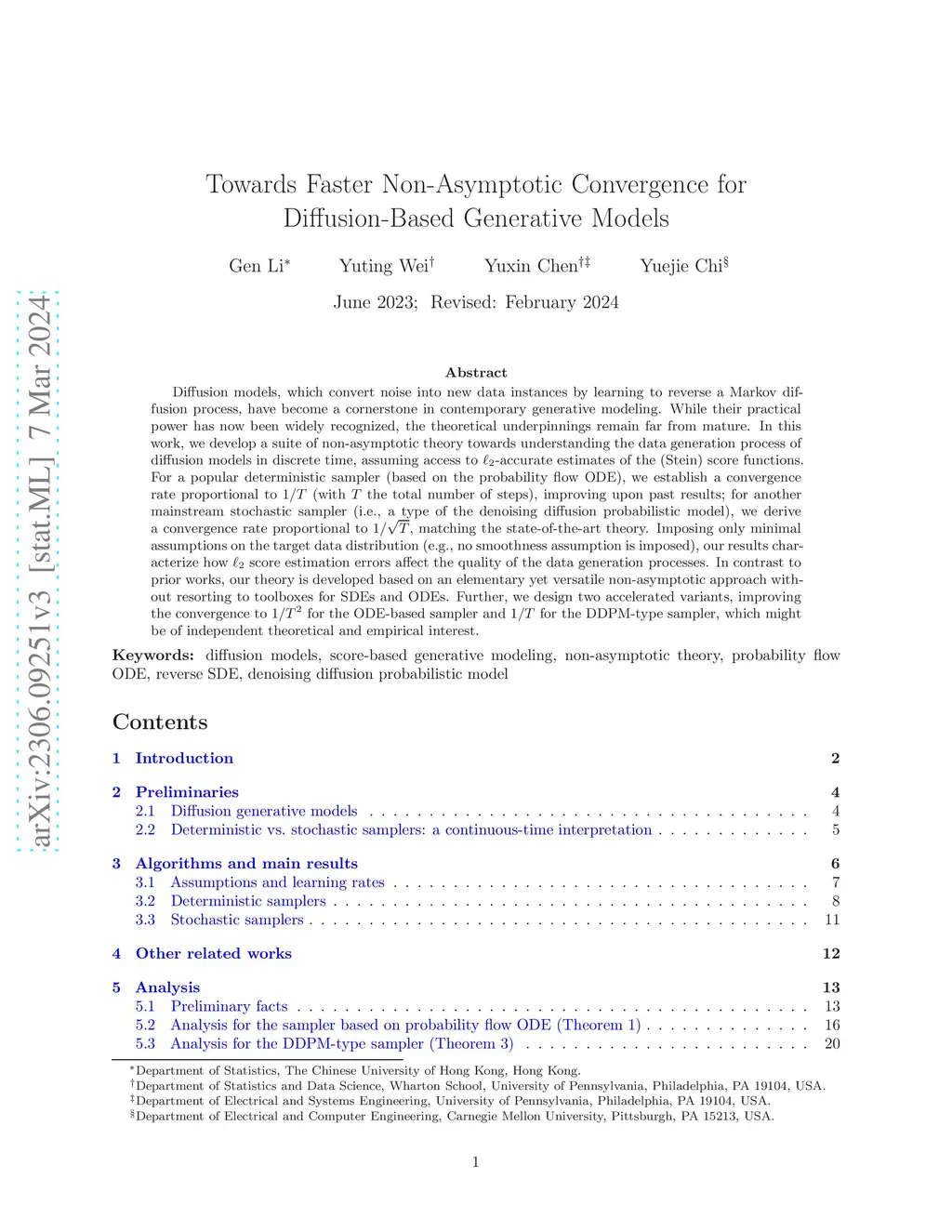 Diffusion models, which convert noise into new data instances by learning to reverse a Markov diffusion process, have become a cornerstone in contemporary generative modeling. While their practical power has now been widely recognized, the theoretical underpinnings remain far from mature. In this work, we develop a suite of non-asymptotic theory towards understanding the data generation process of diffusion models in discrete time, assuming access to -accurate estimates of the (Stein) score functions. For a popular deterministic sampler (based on the probability flow ODE), we establish a convergence rate proportional to (with the total number of steps), improving upon past results; for another mainstream stochastic sampler (i.e., a type of the denoising diffusion probabilistic model), we derive a convergence rate proportional to , matching the state-of-the-art theory. Imposing only minimal assumptions on the target data distribution (e.g., no smoothness assumption is imposed), our results characterize how score estimation errors affect the quality of the data generation processes. In contrast to prior works, our theory is developed based on an elementary yet versatile non-asymptotic approach without resorting to toolboxes for SDEs and ODEs. Further, we design two accelerated variants, improving the convergence to for the ODE-based sampler and for the DDPM-type sampler, which might be of independent theoretical and empirical interest.