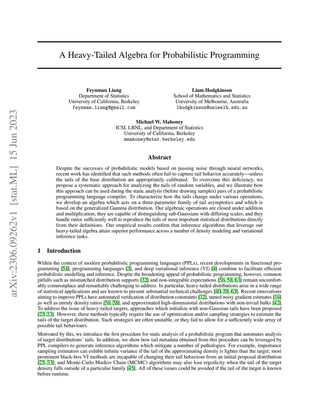 Despite the successes of probabilistic models based on passing noise through neural networks, recent work has identified that such methods often fail to capture tail behavior accurately, unless the tails of the base distribution are appropriately calibrated. To overcome this deficiency, we propose a systematic approach for analyzing the tails of random variables, and we illustrate how this approach can be used during the static analysis (before drawing samples) pass of a probabilistic programming language compiler. To characterize how the tails change under various operations, we develop an algebra which acts on a three-parameter family of tail asymptotics and which is based on the generalized Gamma distribution. Our algebraic operations are closed under addition and multiplication; they are capable of distinguishing sub-Gaussians with differing scales; and they handle ratios sufficiently well to reproduce the tails of most important statistical distributions directly from their definitions. Our empirical results confirm that inference algorithms that leverage our heavy-tailed algebra attain superior performance across a number of density modeling and variational inference tasks.