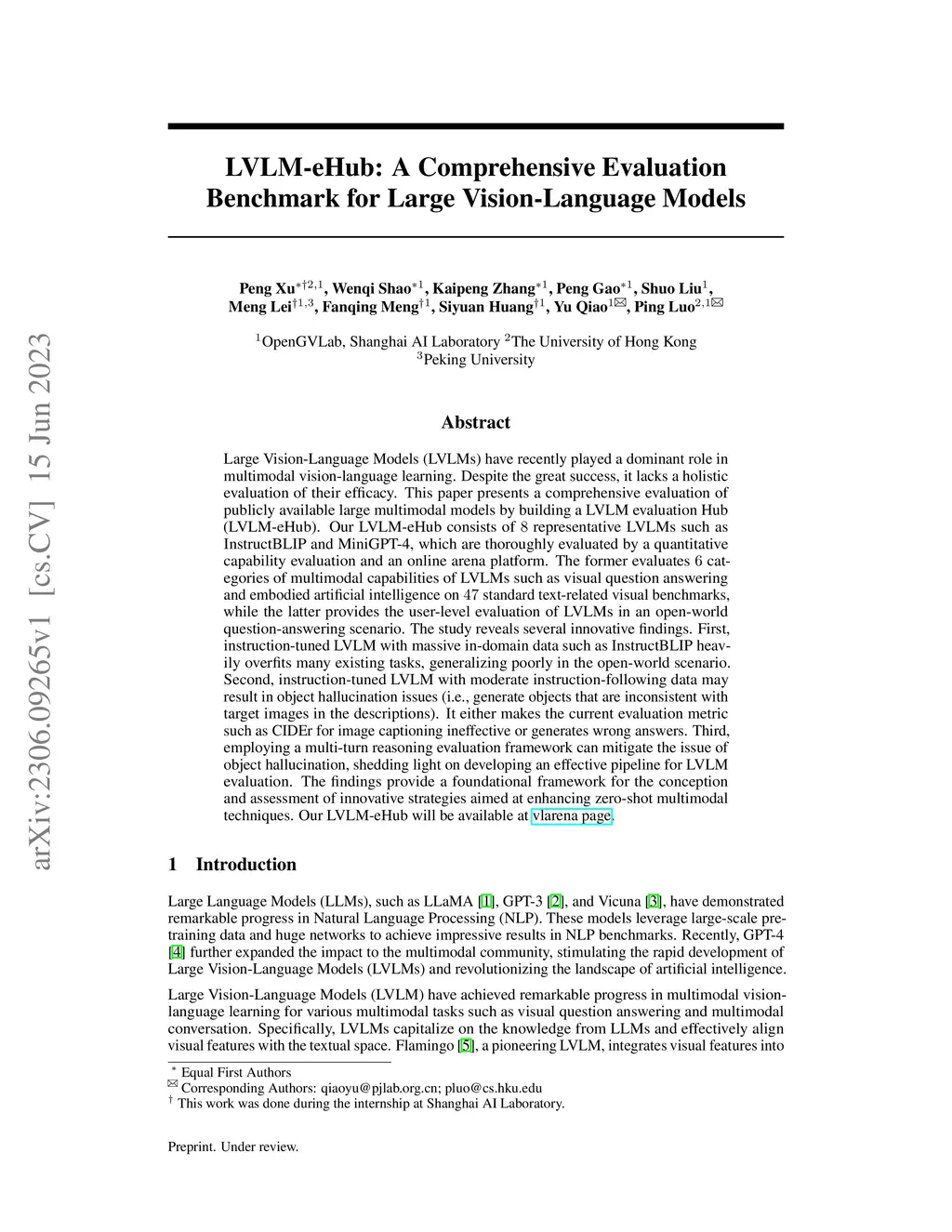 Large Vision-Language Models (LVLMs) have recently played a dominant role in multimodal vision-language learning. Despite the great success, it lacks a holistic evaluation of their efficacy. This paper presents a comprehensive evaluation of publicly available large multimodal models by building a LVLM evaluation Hub (LVLM-eHub). Our LVLM-eHub consists of representative LVLMs such as InstructBLIP and MiniGPT-4, which are thoroughly evaluated by a quantitative capability evaluation and an online arena platform. The former evaluates categories of multimodal capabilities of LVLMs such as visual question answering and embodied artificial intelligence on standard text-related visual benchmarks, while the latter provides the user-level evaluation of LVLMs in an open-world question-answering scenario. The study reveals several innovative findings. First, instruction-tuned LVLM with massive in-domain data such as InstructBLIP heavily overfits many existing tasks, generalizing poorly in the open-world scenario. Second, instruction-tuned LVLM with moderate instruction-following data may result in object hallucination issues (i.e., generate objects that are inconsistent with target images in the descriptions). It either makes the current evaluation metric such as CIDEr for image captioning ineffective or generates wrong answers. Third, employing a multi-turn reasoning evaluation framework can mitigate the issue of object hallucination, shedding light on developing an effective pipeline for LVLM evaluation. The findings provide a foundational framework for the conception and assessment of innovative strategies aimed at enhancing zero-shot multimodal techniques. Our LVLM-eHub will be available at https://github.com/OpenGVLab/Multi-Modality-Arena