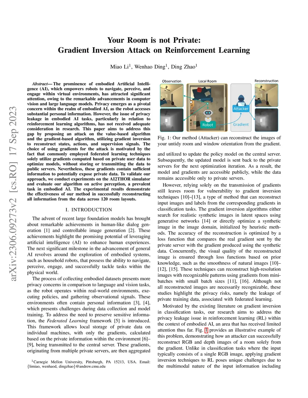 The prominence of embodied Artificial Intelligence (AI), which empowers robots to navigate, perceive, and engage within virtual environments, has attracted significant attention, owing to the remarkable advancements in computer vision and large language models. Privacy emerges as a pivotal concern within the realm of embodied AI, as the robot accesses substantial personal information. However, the issue of privacy leakage in embodied AI tasks, particularly in relation to reinforcement learning algorithms, has not received adequate consideration in research. This paper aims to address this gap by proposing an attack on the value-based algorithm and the gradient-based algorithm, utilizing gradient inversion to reconstruct states, actions, and supervision signals. The choice of using gradients for the attack is motivated by the fact that commonly employed federated learning techniques solely utilize gradients computed based on private user data to optimize models, without storing or transmitting the data to public servers. Nevertheless, these gradients contain sufficient information to potentially expose private data. To validate our approach, we conduct experiments on the AI2THOR simulator and evaluate our algorithm on active perception, a prevalent task in embodied AI. The experimental results demonstrate the effectiveness of our method in successfully reconstructing all information from the data across 120 room layouts.