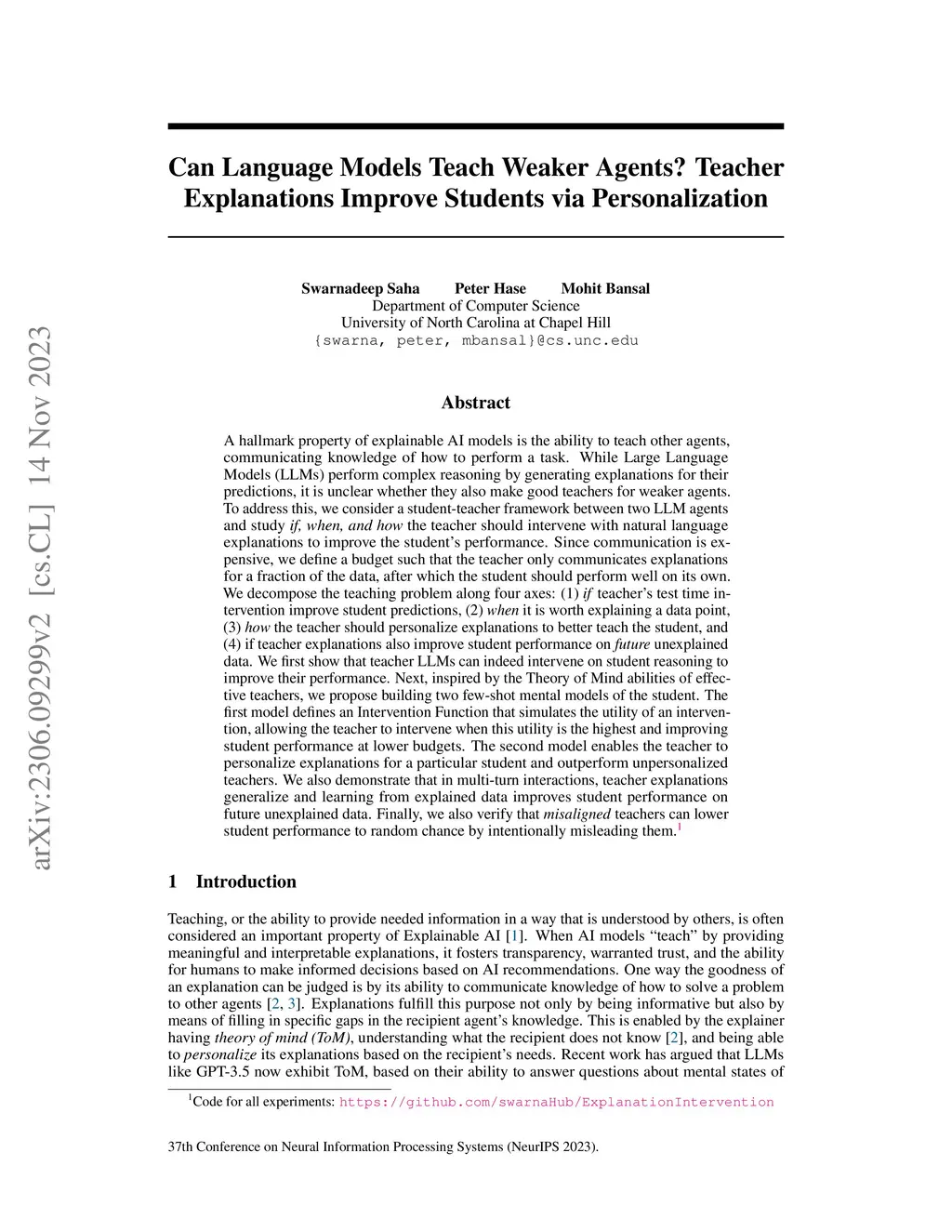 A hallmark property of explainable AI models is the ability to teach other agents, communicating knowledge of how to perform a task. While Large Language Models perform complex reasoning by generating explanations for their predictions, it is unclear whether they also make good teachers for weaker agents. To address this, we consider a student-teacher framework between two LLM agents and study if, when, and how the teacher should intervene with natural language explanations to improve the student's performance. Since communication is expensive, we define a budget such that the teacher only communicates explanations for a fraction of the data, after which the student should perform well on its own. We decompose the teaching problem along four axes: (1) if teacher's test time intervention improve student predictions, (2) when it is worth explaining a data point, (3) how the teacher should personalize explanations to better teach the student, and (4) if teacher explanations also improve students on future unexplained data. We first show that teacher LLMs can indeed intervene on student reasoning to improve their performance. Next, inspired by the Theory of Mind abilities of effective teachers, we propose building two few-shot mental models of the student. The first model defines an Intervention Function that simulates the utility of an intervention, allowing the teacher to intervene when this utility is the highest and improving student performance at lower budgets. The second model enables the teacher to personalize explanations for a particular student and outperform unpersonalized teachers. We also demonstrate that in multi-turn interactions, teacher explanations generalize and learning from explained data improves student performance on future unexplained data. Finally, we verify that misaligned teachers can lower student performance to random chance by intentionally misleading them.