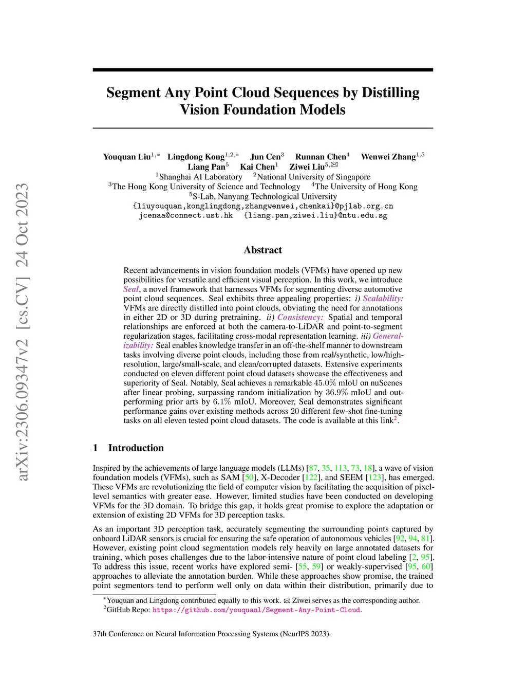 Recent advancements in vision foundation models (VFMs) have opened up new possibilities for versatile and efficient visual perception. In this work, we introduce Seal, a novel framework that harnesses VFMs for segmenting diverse automotive point cloud sequences. Seal exhibits three appealing properties: i) Scalability: VFMs are directly distilled into point clouds, obviating the need for annotations in either 2D or 3D during pretraining. ii) Consistency: Spatial and temporal relationships are enforced at both the camera-to-LiDAR and point-to-segment regularization stages, facilitating cross-modal representation learning. iii) Generalizability: Seal enables knowledge transfer in an off-the-shelf manner to downstream tasks involving diverse point clouds, including those from real/synthetic, low/high-resolution, large/small-scale, and clean/corrupted datasets. Extensive experiments conducted on eleven different point cloud datasets showcase the effectiveness and superiority of Seal. Notably, Seal achieves a remarkable 45.0% mIoU on nuScenes after linear probing, surpassing random initialization by 36.9% mIoU and outperforming prior arts by 6.1% mIoU. Moreover, Seal demonstrates significant performance gains over existing methods across 20 different few-shot fine-tuning tasks on all eleven tested point cloud datasets.