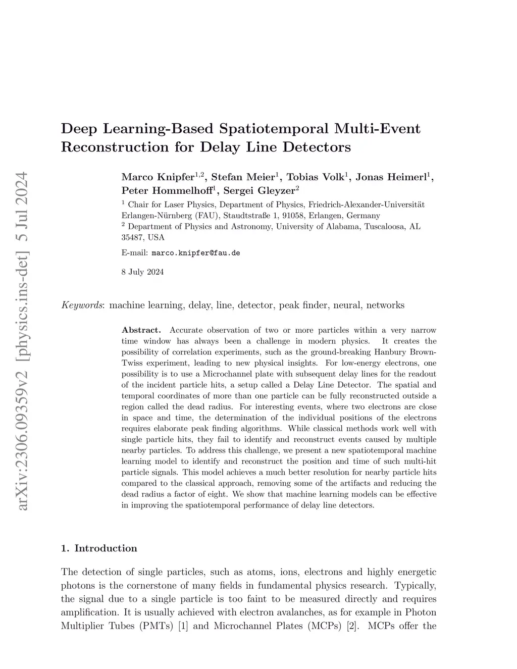 Accurate observation of two or more particles within a very narrow time window has always been a challenge in modern physics. It creates the possibility of correlation experiments, such as the ground-breaking Hanbury Brown-Twiss experiment, leading to new physical insights. For low-energy electrons, one possibility is to use a microchannel plate with subsequent delay lines for the readout of the incident particle hits, a setup called a Delay Line Detector. The spatial and temporal coordinates of more than one particle can be fully reconstructed outside a region called the dead radius. For interesting events, where two electrons are close in space and time, the determination of the individual positions of the electrons requires elaborate peak finding algorithms. While classical methods work well with single particle hits, they fail to identify and reconstruct events caused by multiple nearby particles. To address this challenge, we present a new spatiotemporal machine learning model to identify and reconstruct the position and time of such multi-hit particle signals. This model achieves a much better resolution for nearby particle hits compared to the classical approach, removing some of the artifacts and reducing the dead radius by half. We show that machine learning models can be effective in improving the spatiotemporal performance of delay line detectors.