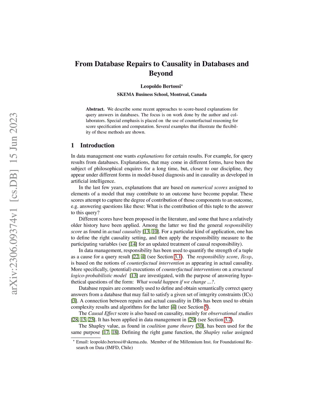 We describe some recent approaches to score-based explanations for query answers in databases. The focus is on work done by the author and collaborators. Special emphasis is placed on the use of counterfactual reasoning for score specification and computation. Several examples that illustrate the flexibility of these methods are shown.