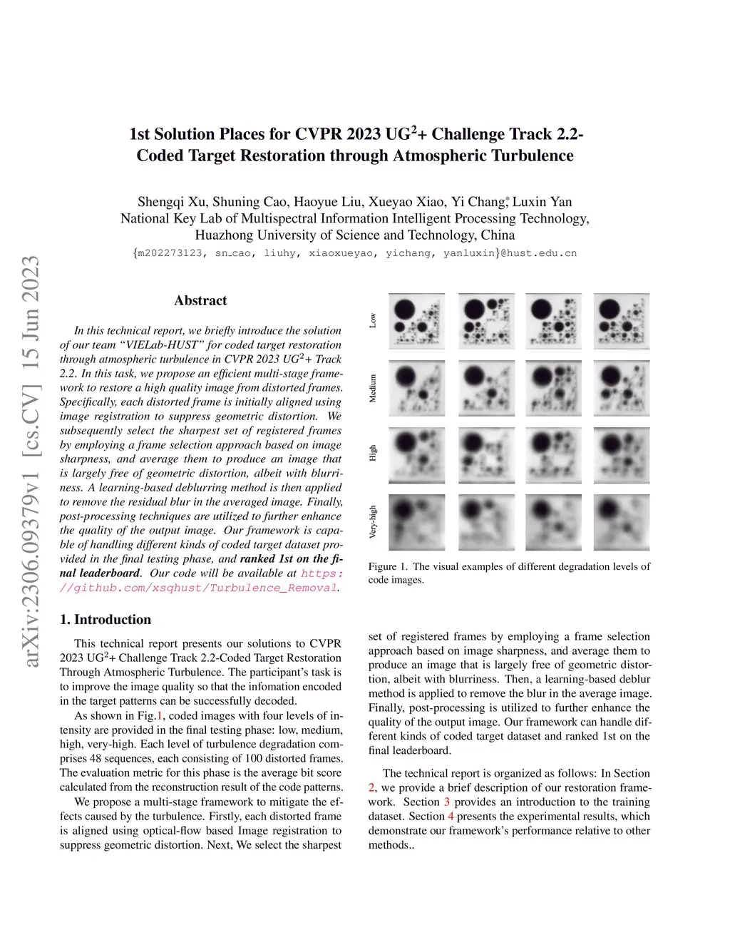 In this technical report, we briefly introduce the solution of our team VIELab-HUST for coded target restoration through atmospheric turbulence in CVPR 2023 UG+ Track 2.2. In this task, we propose an efficient multi-stage framework to restore a high quality image from distorted frames. Specifically, each distorted frame is initially aligned using image registration to suppress geometric distortion. We subsequently select the sharpest set of registered frames by employing a frame selection approach based on image sharpness, and average them to produce an image that is largely free of geometric distortion, albeit with blurriness. A learning-based deblurring method is then applied to remove the residual blur in the averaged image. Finally, post-processing techniques are utilized to further enhance the quality of the output image. Our framework is capable of handling different kinds of coded target dataset provided in the final testing phase, and ranked 1st on the final leaderboard. Our code will be available at https://github.com/xsqhust/Turbulence_Removal.
