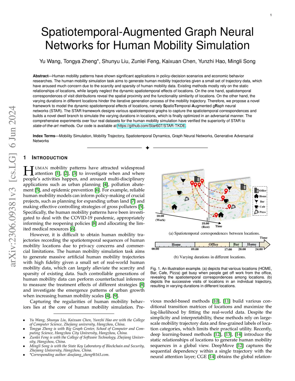 Human mobility patterns have shown significant applications in policy-decision scenarios and economic behavior researches. The human mobility simulation task aims to generate human mobility trajectories given a small set of trajectory data, which have aroused much concern due to the scarcity and sparsity of human mobility data. Existing methods mostly rely on the static relationships of locations, while largely neglect the dynamic spatiotemporal effects of locations. On the one hand, spatiotemporal correspondences of visit distributions reveal the spatial proximity and the functionality similarity of locations. On the other hand, the varying durations in different locations hinder the iterative generation process of the mobility trajectory. Therefore, we propose a novel framework to model the dynamic spatiotemporal effects of locations, namely SpatioTemporal-Augmented gRaph neural networks (STAR). The STAR framework designs various spatiotemporal graphs to capture the spatiotemporal correspondences and builds a novel dwell branch to simulate the varying durations in locations, which is finally optimized in an adversarial manner. The comprehensive experiments over four real datasets for the human mobility simulation have verified the superiority of STAR to state-of-the-art methods. Our code is available at https://github.com/Star607/STAR-TKDE.
