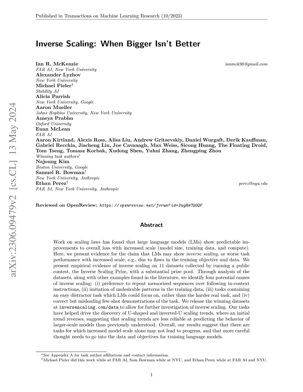 Work on scaling laws has found that large language models (LMs) show predictable improvements to overall loss with increased scale (model size, training data, and compute). Here, we present evidence for the claim that LMs may show inverse scaling, or worse task performance with increased scale, e.g., due to flaws in the training objective and data. We present empirical evidence of inverse scaling on 11 datasets collected by running a public contest, the Inverse Scaling Prize, with a substantial prize pool. Through analysis of the datasets, along with other examples found in the literature, we identify four potential causes of inverse scaling: (i) preference to repeat memorized sequences over following in-context instructions, (ii) imitation of undesirable patterns in the training data, (iii) tasks containing an easy distractor task which LMs could focus on, rather than the harder real task, and (iv) correct but misleading few-shot demonstrations of the task. We release the winning datasets at https://inversescaling.com/data to allow for further investigation of inverse scaling. Our tasks have helped drive the discovery of U-shaped and inverted-U scaling trends, where an initial trend reverses, suggesting that scaling trends are less reliable at predicting the behavior of larger-scale models than previously understood. Overall, our results suggest that there are tasks for which increased model scale alone may not lead to progress, and that more careful thought needs to go into the data and objectives for training language models.