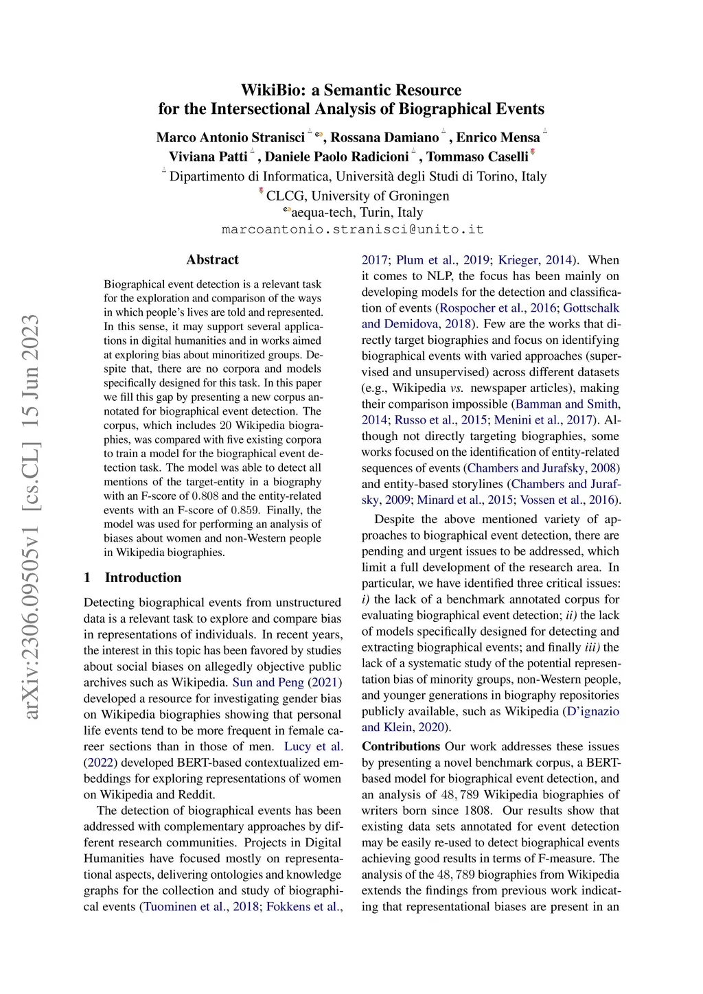 Biographical event detection is a relevant task for the exploration and comparison of the ways in which people's lives are told and represented. In this sense, it may support several applications in digital humanities and in works aimed at exploring bias about minoritized groups. Despite that, there are no corpora and models specifically designed for this task. In this paper we fill this gap by presenting a new corpus annotated for biographical event detection. The corpus, which includes 20 Wikipedia biographies, was compared with five existing corpora to train a model for the biographical event detection task. The model was able to detect all mentions of the target-entity in a biography with an F-score of 0.808 and the entity-related events with an F-score of 0.859. Finally, the model was used for performing an analysis of biases about women and non-Western people in Wikipedia biographies.