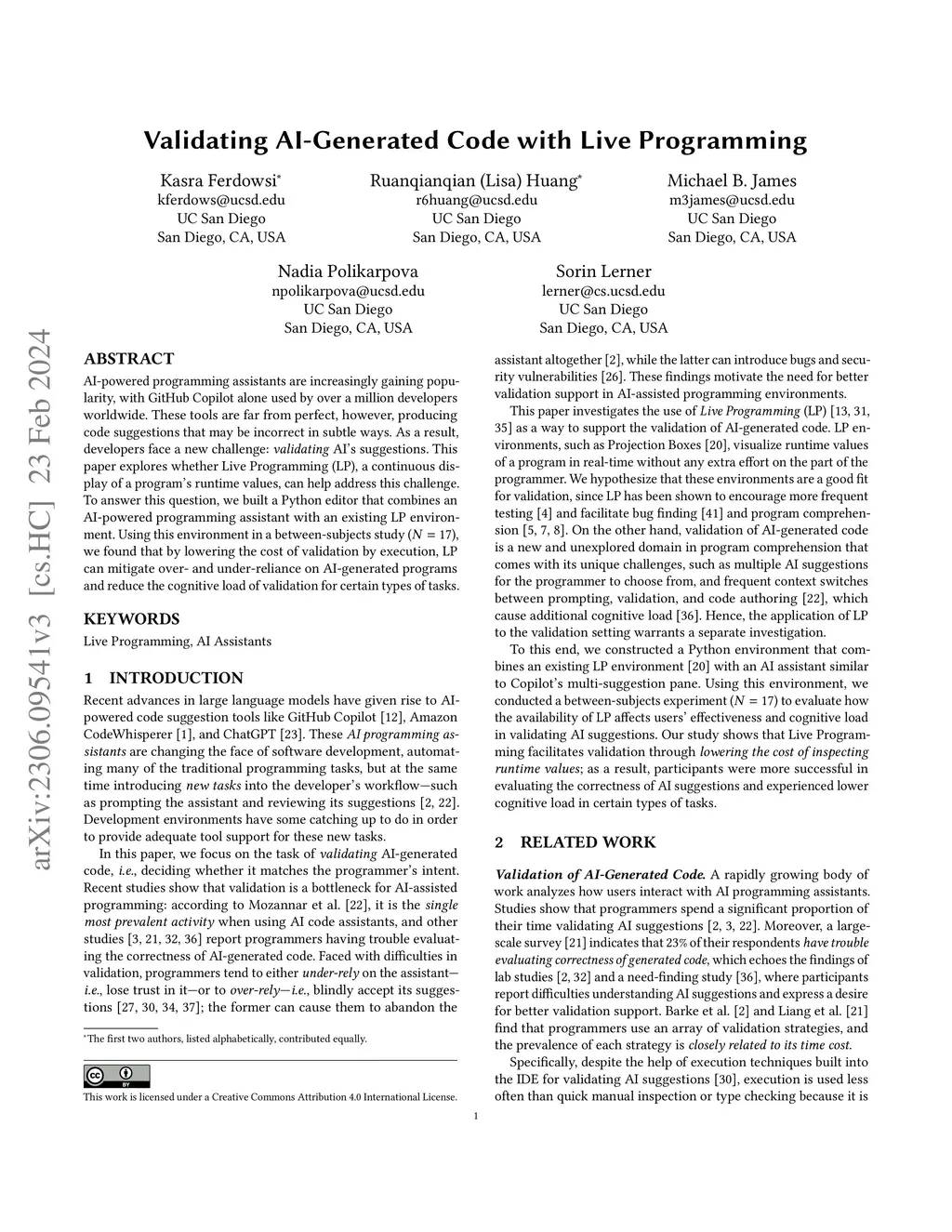 AI-powered programming assistants are increasingly gaining popularity, with GitHub Copilot alone used by over a million developers worldwide. These tools are far from perfect, however, producing code suggestions that may be incorrect in subtle ways. As a result, developers face a new challenge: validating AI's suggestions. This paper explores whether Live Programming (LP), a continuous display of a program's runtime values, can help address this challenge. To answer this question, we built a Python editor that combines an AI-powered programming assistant with an existing LP environment. Using this environment in a between-subjects study (N=17), we found that by lowering the cost of validation by execution, LP can mitigate over- and under-reliance on AI-generated programs and reduce the cognitive load of validation for certain types of tasks.