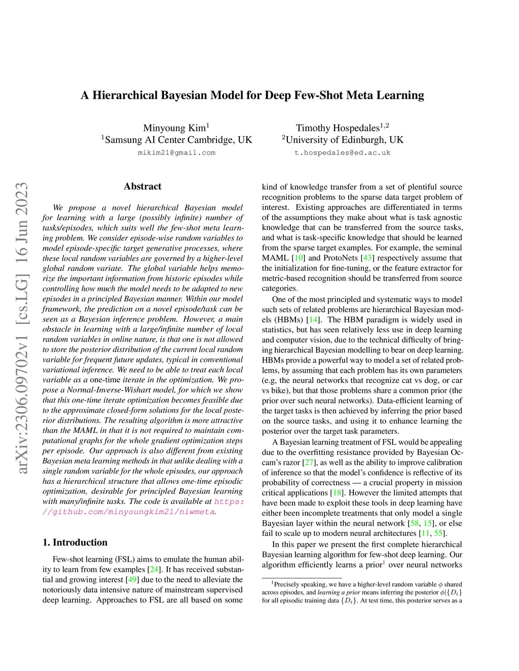 We propose a novel hierarchical Bayesian model for learning with a large (possibly infinite) number of tasks/episodes, which suits well the few-shot meta learning problem. We consider episode-wise random variables to model episode-specific target generative processes, where these local random variables are governed by a higher-level global random variate. The global variable helps memorize the important information from historic episodes while controlling how much the model needs to be adapted to new episodes in a principled Bayesian manner. Within our model framework, the prediction on a novel episode/task can be seen as a Bayesian inference problem. However, a main obstacle in learning with a large/infinite number of local random variables in online nature, is that one is not allowed to store the posterior distribution of the current local random variable for frequent future updates, typical in conventional variational inference. We need to be able to treat each local variable as a one-time iterate in the optimization. We propose a Normal-Inverse-Wishart model, for which we show that this one-time iterate optimization becomes feasible due to the approximate closed-form solutions for the local posterior distributions. The resulting algorithm is more attractive than the MAML in that it is not required to maintain computational graphs for the whole gradient optimization steps per episode. Our approach is also different from existing Bayesian meta learning methods in that unlike dealing with a single random variable for the whole episodes, our approach has a hierarchical structure that allows one-time episodic optimization, desirable for principled Bayesian learning with many/infinite tasks. The code is available at \url{https://github.com/minyoungkim21/niwmeta}.