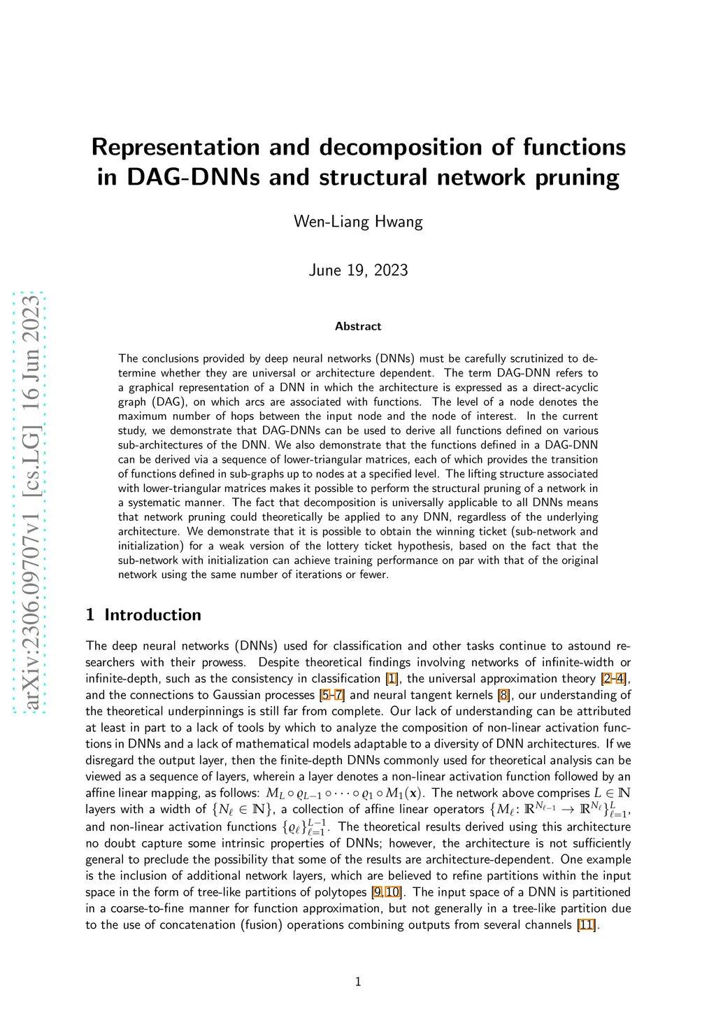 The conclusions provided by deep neural networks (DNNs) must be carefully scrutinized to determine whether they are universal or architecture dependent. The term DAG-DNN refers to a graphical representation of a DNN in which the architecture is expressed as a direct-acyclic graph (DAG), on which arcs are associated with functions. The level of a node denotes the maximum number of hops between the input node and the node of interest. In the current study, we demonstrate that DAG-DNNs can be used to derive all functions defined on various sub-architectures of the DNN. We also demonstrate that the functions defined in a DAG-DNN can be derived via a sequence of lower-triangular matrices, each of which provides the transition of functions defined in sub-graphs up to nodes at a specified level. The lifting structure associated with lower-triangular matrices makes it possible to perform the structural pruning of a network in a systematic manner. The fact that decomposition is universally applicable to all DNNs means that network pruning could theoretically be applied to any DNN, regardless of the underlying architecture. We demonstrate that it is possible to obtain the winning ticket (sub-network and initialization) for a weak version of the lottery ticket hypothesis, based on the fact that the sub-network with initialization can achieve training performance on par with that of the original network using the same number of iterations or fewer.