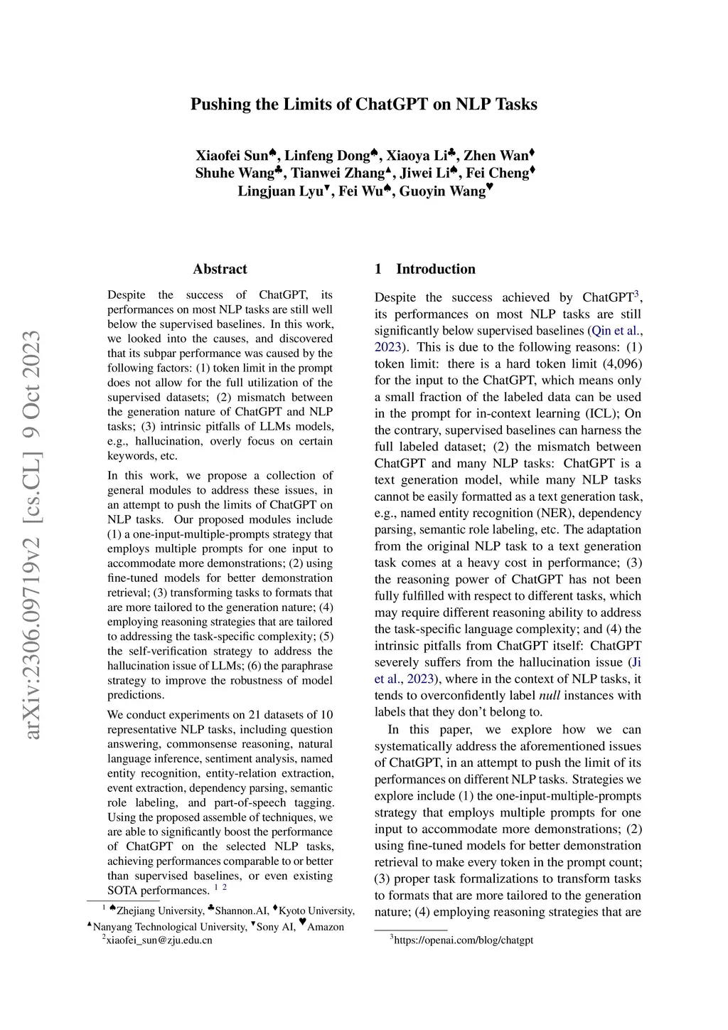 Despite the success of ChatGPT, its performances on most NLP tasks are still well below the supervised baselines. In this work, we looked into the causes, and discovered that its subpar performance was caused by the following factors: (1) token limit in the prompt does not allow for the full utilization of the supervised datasets; (2) mismatch between the generation nature of ChatGPT and NLP tasks; (3) intrinsic pitfalls of LLMs models, e.g., hallucination, overly focus on certain keywords, etc. In this work, we propose a collection of general modules to address these issues, in an attempt to push the limits of ChatGPT on NLP tasks. Our proposed modules include (1) a one-input-multiple-prompts strategy that employs multiple prompts for one input to accommodate more demonstrations; (2) using fine-tuned models for better demonstration retrieval; (3) transforming tasks to formats that are more tailored to the generation nature; (4) employing reasoning strategies that are tailored to addressing the task-specific complexity; (5) the self-verification strategy to address the hallucination issue of LLMs; (6) the paraphrase strategy to improve the robustness of model predictions. We conduct experiments on 21 datasets of 10 representative NLP tasks, including question answering, commonsense reasoning, natural language inference, sentiment analysis, named entity recognition, entity-relation extraction, event extraction, dependency parsing, semantic role labeling, and part-of-speech tagging. Using the proposed assemble of techniques, we are able to significantly boost the performance of ChatGPT on the selected NLP tasks, achieving performances comparable to or better than supervised baselines, or even existing SOTA performances.