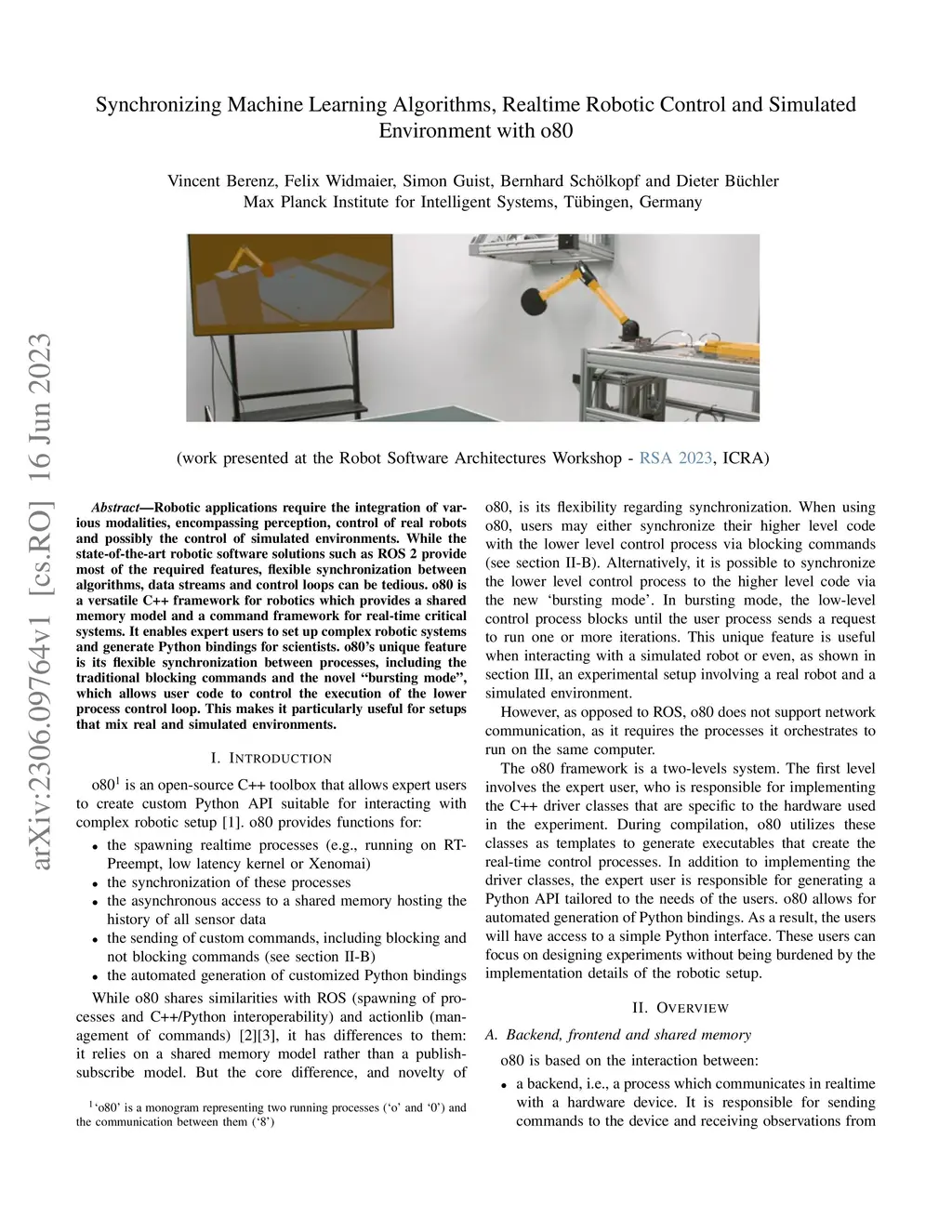 Robotic applications require the integration of various modalities, encompassing perception, control of real robots and possibly the control of simulated environments. While the state-of-the-art robotic software solutions such as ROS 2 provide most of the required features, flexible synchronization between algorithms, data streams and control loops can be tedious. o80 is a versatile C++ framework for robotics which provides a shared memory model and a command framework for real-time critical systems. It enables expert users to set up complex robotic systems and generate Python bindings for scientists. o80's unique feature is its flexible synchronization between processes, including the traditional blocking commands and the novel ``bursting mode'', which allows user code to control the execution of the lower process control loop. This makes it particularly useful for setups that mix real and simulated environments.