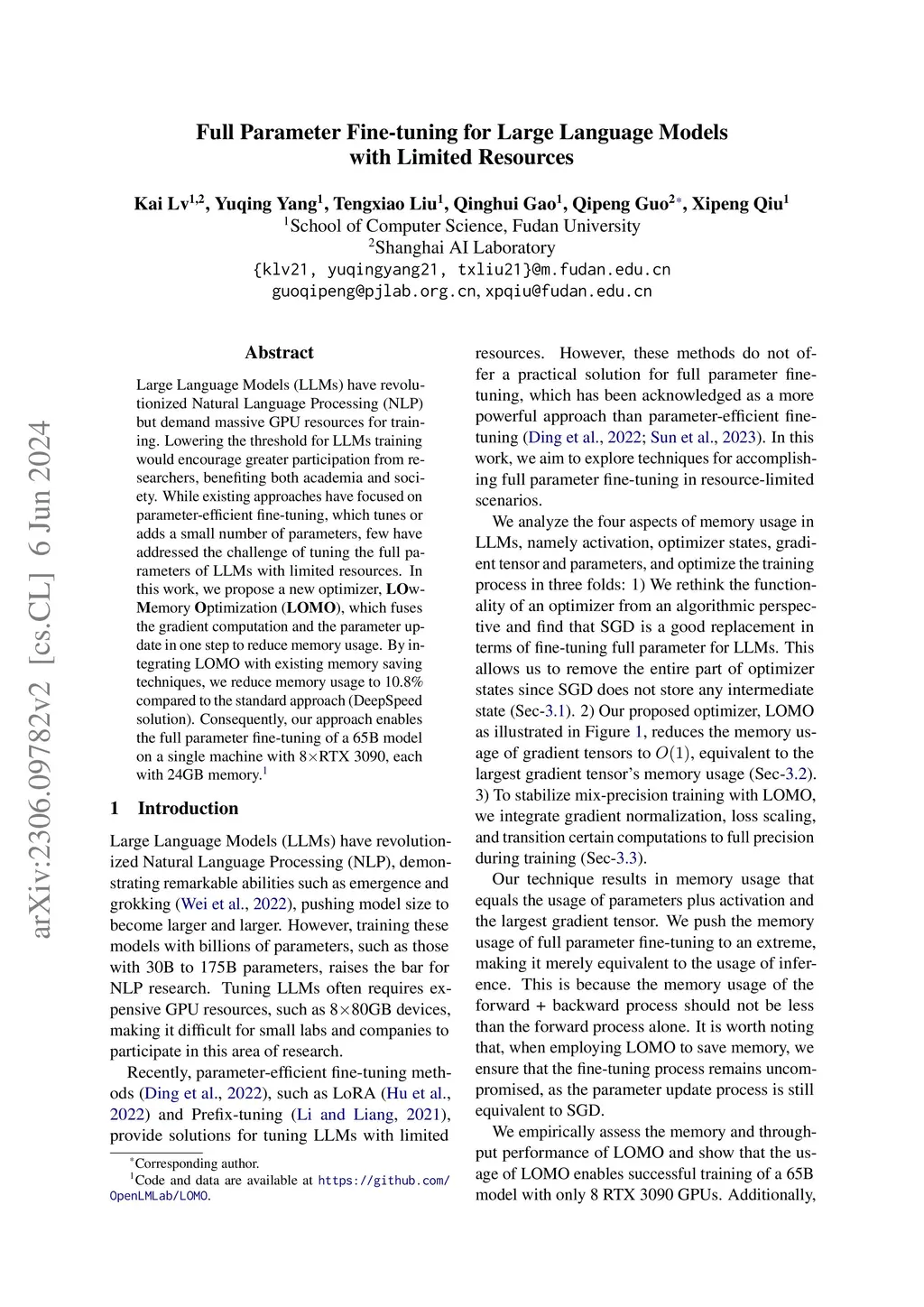 Large Language Models (LLMs) have revolutionized Natural Language Processing (NLP) but demand massive GPU resources for training. Lowering the threshold for LLMs training would encourage greater participation from researchers, benefiting both academia and society. While existing approaches have focused on parameter-efficient fine-tuning, which tunes or adds a small number of parameters, few have addressed the challenge of tuning the full parameters of LLMs with limited resources. In this work, we propose a new optimizer, LOw-Memory Optimization (LOMO), which fuses the gradient computation and the parameter update in one step to reduce memory usage. By integrating LOMO with existing memory saving techniques, we reduce memory usage to 10.8% compared to the standard approach (DeepSpeed solution). Consequently, our approach enables the full parameter fine-tuning of a 65B model on a single machine with 8 RTX 3090, each with 24GB memory.Code and data are available at https://github.com/OpenLMLab/LOMO.
